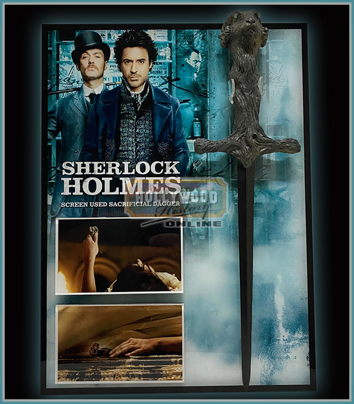 Detective Sherlock Holmes and his stalwart partner Watson engage in a battle of wits and brawn with a nemesis whose plot is a threat to all of England. From the 2009 adventure Sherlock Holmes, this is sacrificial dagger the films plot is centered around. A woman under the thrall of Lord Blackwood (Mark Strong) almost kills herself with the dagger before Holmes (Robert Downey Jr.) and Watson (Jude Law) saves her. The handle of the dagger has a hard rubber ram’s head with faux gems for eyes with a black resin blade.