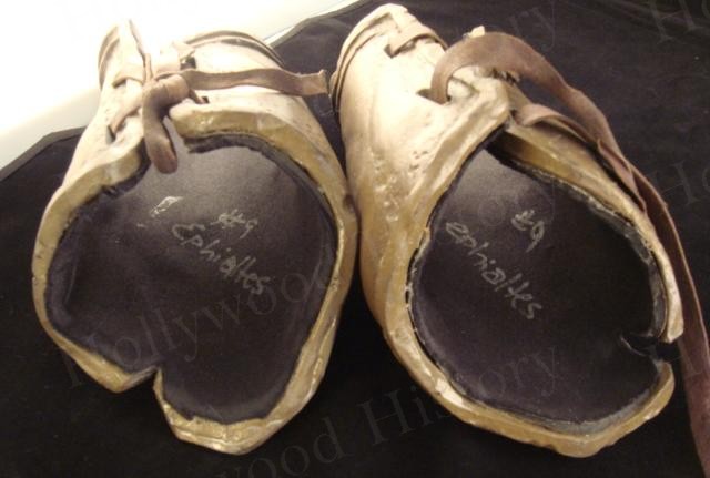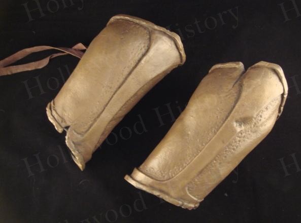 Pair of wrist gauntlets worn by Ephialtes of Trachis, the hunchback Spartan traitor in the 2006 epic film 300. Gauntlets are made of hard rubber and have leather ties up the side. They have Ephialtes written on the inside. Measures 9″ long.