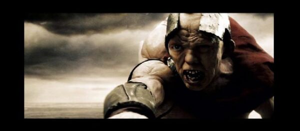 Pair of wrist gauntlets worn by Ephialtes of Trachis, the hunchback Spartan traitor in the 2006 epic film 300. Gauntlets are made of hard rubber and have leather ties up the side. They have Ephialtes written on the inside. Measures 9″ long