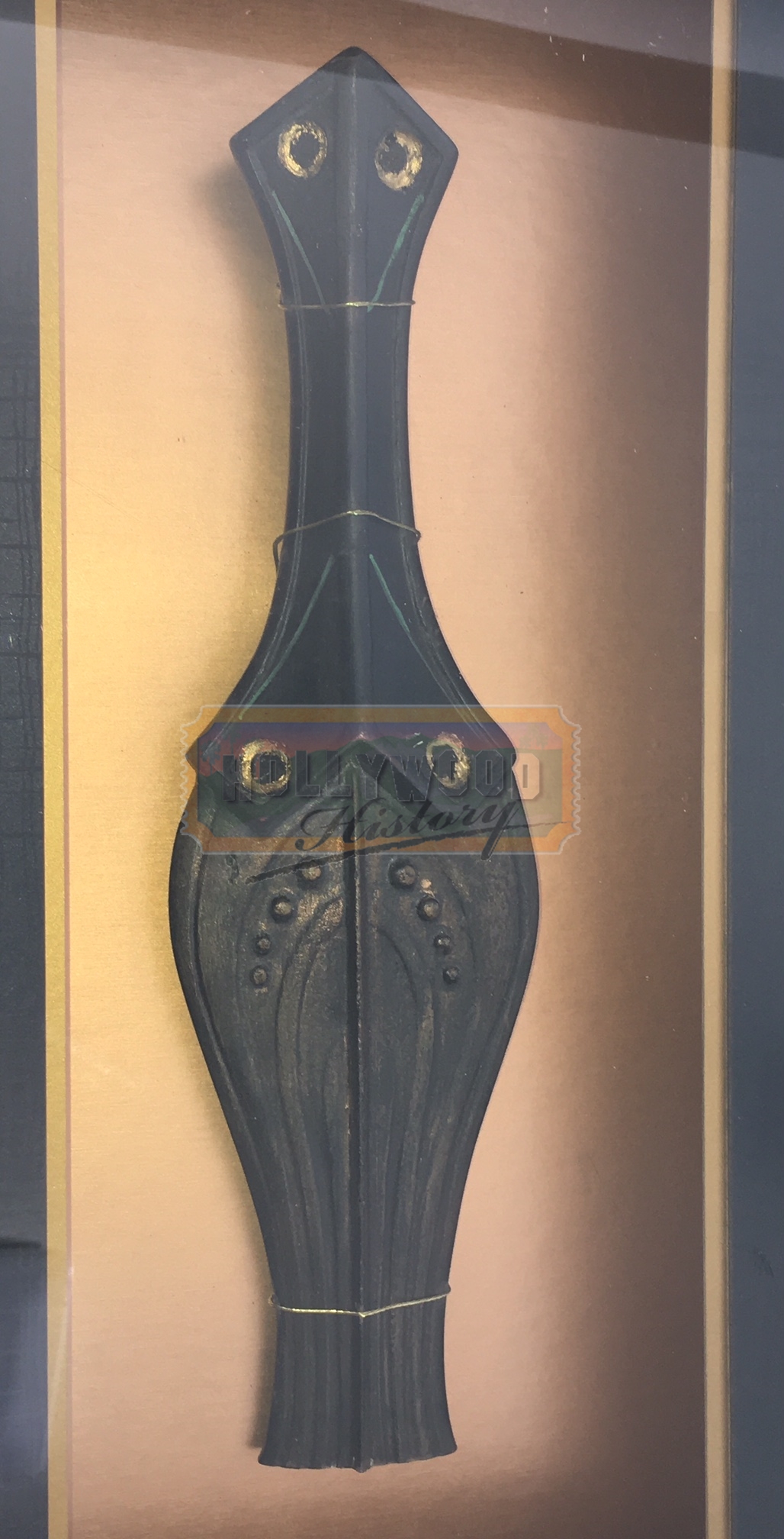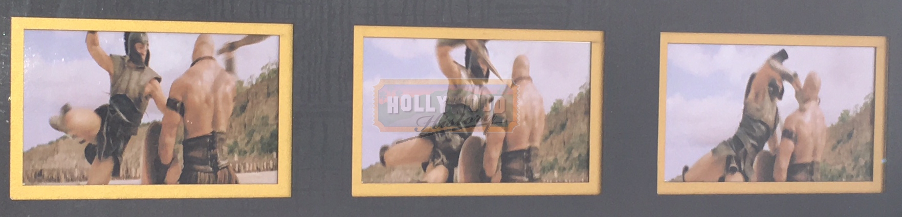 A special effects sword used in Wolfgang Petersen’s adaptation of Homer’s great epic Troy. After falling for the beautiful Helen (Diane Kruger), Trojan prince Paris (Orlando Bloom) smuggles her aboard the ship of his brother, Hector (Eric Bana) to take her to Troy. Seeking revenge, the Greek armies led by Agamemnon (Brian Cox) and the legendary warrior Achilles (Brad Pitt) set sail for Troy, where one of history’s greatest wars will be waged. The entire piece has been hand-painted and detailed to resemble ancient forged bronze. This sword is Achilles’ SFX version, which features a special effects cut off tip that would have been used during one of the many fight scenes including the one with Boagrius, to give the effect of an actor being stabbed. This item exhibits some wear due to production use and storage and comes in a custom display frame, however the plexiglass has a few scratches from transit.