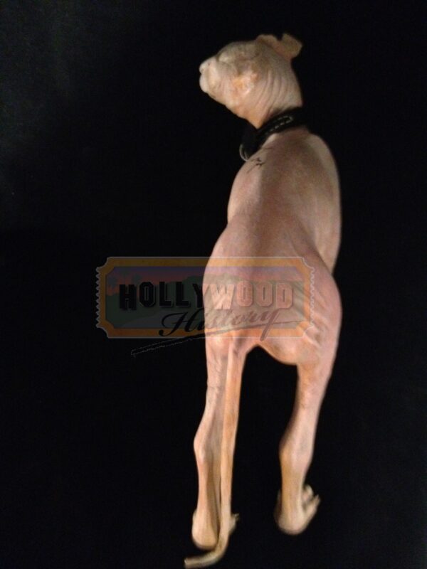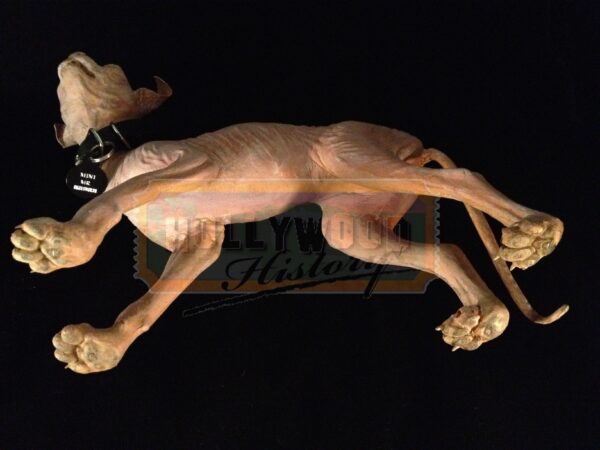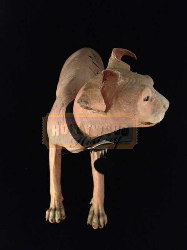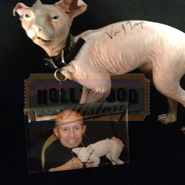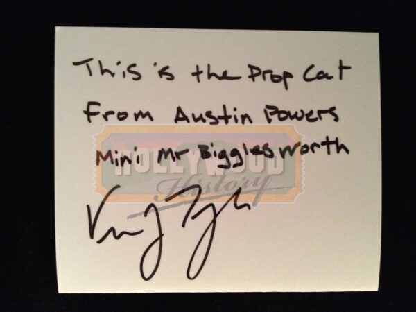 Austin Powers: The Spy Who Shagged Me, released in 1999 included a certain fictional cat know as Mr. Bigglesworth. Belonging to Dr. Evil and was forced to escape hastily with Dr. Evil in a cryogenic capsule, but lost all of his fur due to an error in the thawing out process. Dr. Evil’s miniature clone Mini-Me, has a tiny cat called “Mini Mr. Bigglesworth”, presumably also a clone of Mr. Bigglesworth. One of Doctor Evil’s lines in the movie to Mini Me is “No Mini Me, we do not gnaw on our kitty.” To illustrate his importance, Dr. Evil states in the first movie: “When Dr. Evil gets angry, Mr. Bigglesworth gets upset. And when Mr. Bigglesworth gets upset, people DIE!” This is the stunt “Mini Mr. Bigglesworth” used in the film and held/carried by Mini-Me (Verne Troyer). This cat was used when the real cat was not needed or during rehearsals. This prop cat has been hand signed by Verne Troyer, and will include a picture of Verne holding this exact cat. Along with a Hollywood Hisory COA this item will also come with a signed paper from Verne.