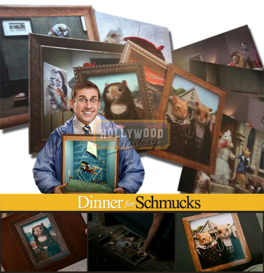 Tim Conrad (Paul Rudd) is a mid-level financial executive who acquires a negotiation over special novelty lamps with a wealthy Swiss businessman. Impressed by Tim’s ingenuity, his boss invites him to a “dinner for winners” in which he must find and bring an eccentric person with a special talent and soon learns it is more of a “dinner for idiots” and the partygoers will be mocked mercilessly. The following day, Tim accidentally hits Barry Speck (Steve Carell) with his car when Barry tries to retrieve a dead mouse in the road. Witnessing Barry’s bizarre behavior (he taxidermies mice and arranges them into elaborate dioramas), Tim realizes he is the perfect loser for the dinner. From the 2010 comedy Dinner for Schmucks, these are Barry’s screen used Mousterpiece pictures seen during different times of the film. The first time is when Tim hits Barry with his car and Barry shows Tim the pictures he has taken proving his talent. The next time we see them while Barry is sleeping and Tim finds them laying around and realizes how special Barry truly is.