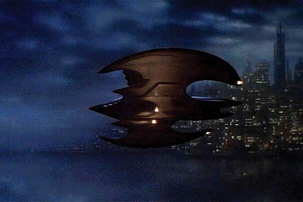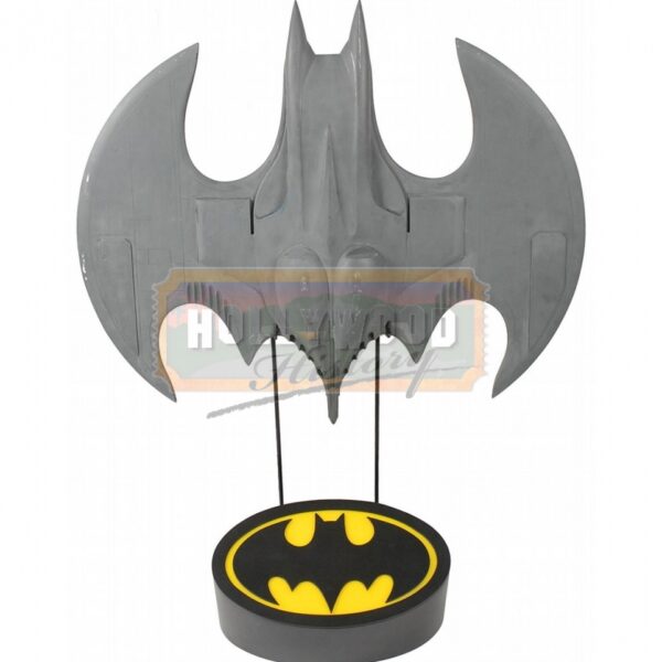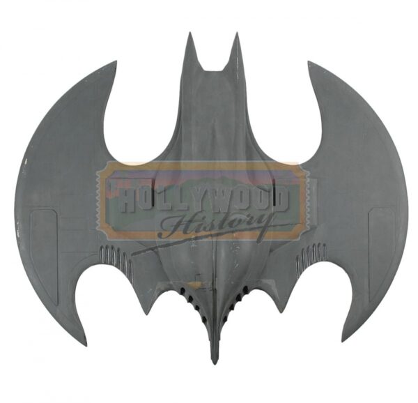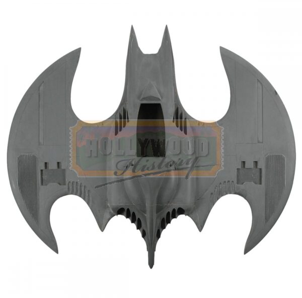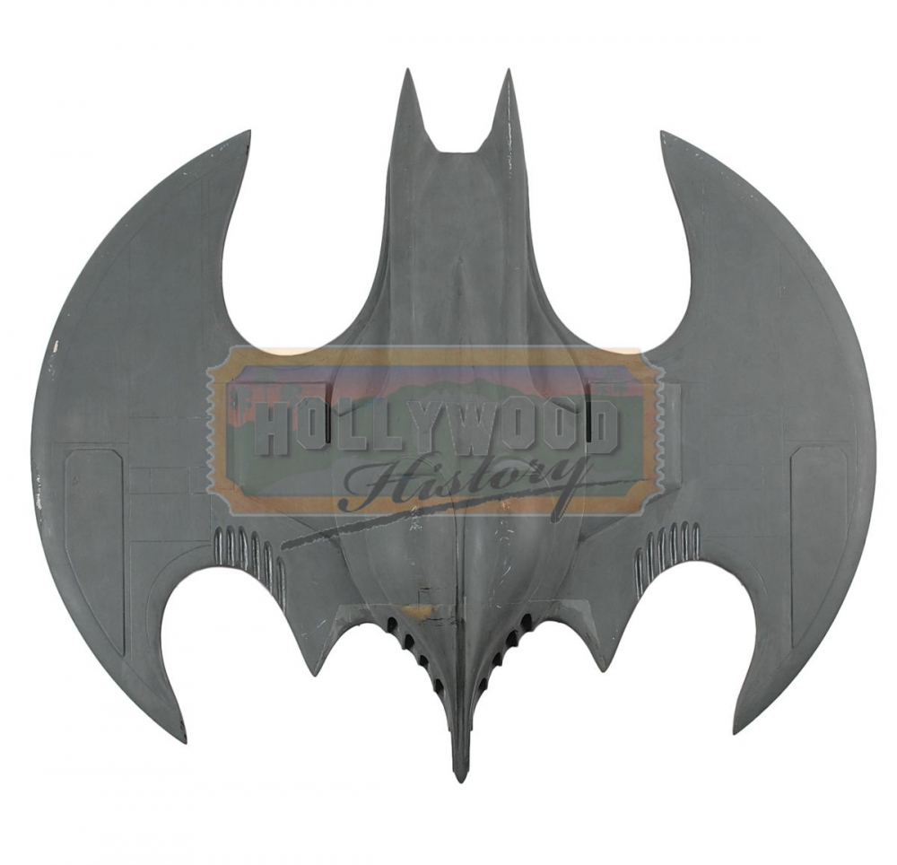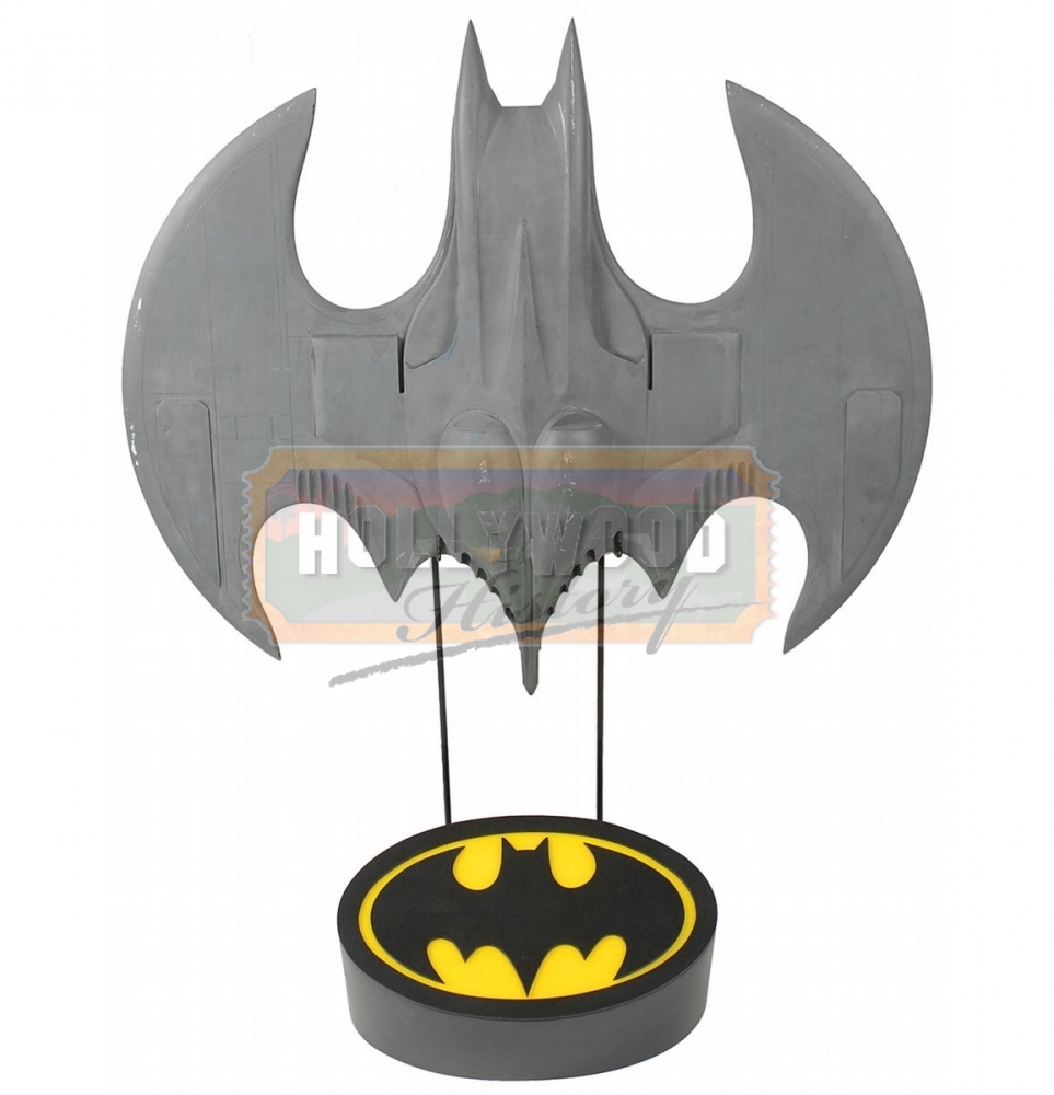 Very nice production-used Batwing miniature used in the 1989 film Batman. Detailed hollow fiberglass model measures 27? wide and 24? long. Entire model has been hand-painted with gray paint. There were three different sized models created for different depth and purposes: a 1/4 scale (about 10 feet long), a 1/12 scale (about 2 feet long), and 1/48 scale (about 6 inches long). In fine condition, with no canopy. Also includes a custom-made stand showing the instantly recognizable Batman logo. This is one of the miniature production Batwings that would have been used in the flying sequences.