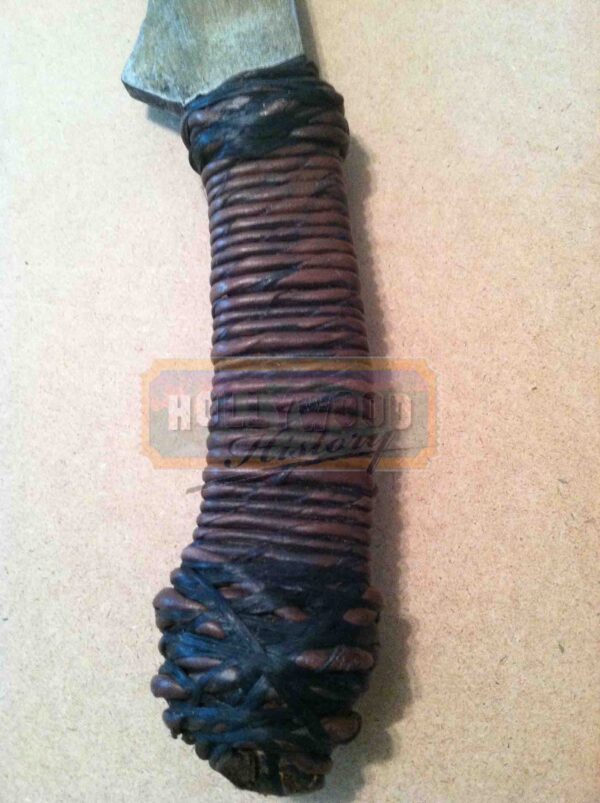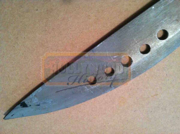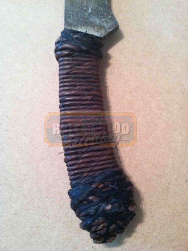 The Book of Eli is a 2010 film directed by the Hughes brothers and starring Denzel Washington. The story revolves around Eli, a nomad in a post-apocalyptic world who is told by a voice to deliver his copy of a mysterious book to a safe location on the West Coast of the United States. Straight from the set of the film is Eli’s (Denzel Washington) stunt rubber blade sword with wrapped leather like handle. This is the rubber stunt blade version painted to look like aged metal and features the five holes on the blade. This stunt sword was screen used by Eli (Denzel Washington) throughout the movie when performing stunt actions. The stunt sword measures approximately 26″ and is a very recognizable prop to own from the film. Please see our Custom Display Options, View our Gallery, or Contact Us for more information about Custom Displaying this item.