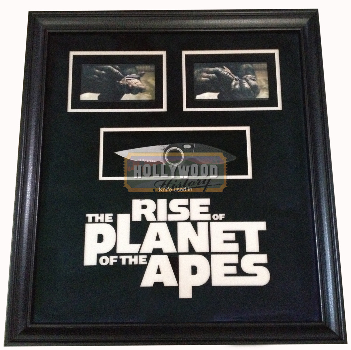 A substance, designed to help the brain repair itself, gives rise to a super-intelligent chimp who leads an ape uprising. This is Caesar’s hero knife used in the 2011 film, Rise of the Planet of the Apes. This exact knife can be seen when Caesar steals it from one of Dodge’s friends that is brought into the cage area, affixes it to a stick found in the yard and makes a tool to unlock his cage. It can also be seen later after going back to Will’s house in the middle of the night. Caesar steals two canisters of the ALZ 113 drug and uses the knife to puncture the canisters to release the drug to the rest of the monkeys in the sanctuary. This knife still has traces of “hair” from the device used on set to act as Caesar when the knife was being used during filming.