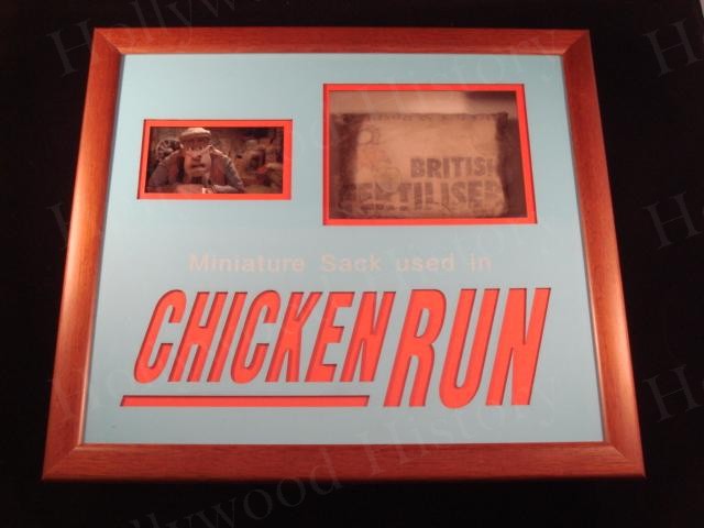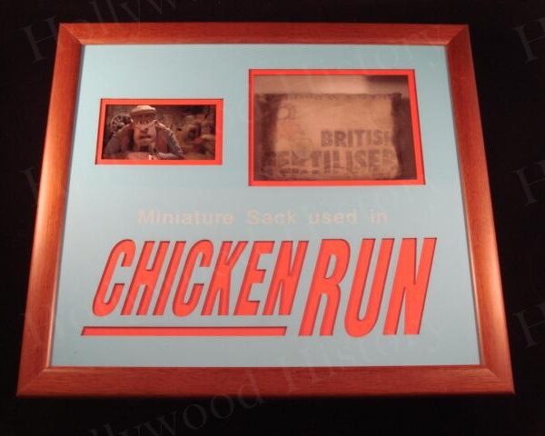Chicken Run is a British stop-motion animation film made by the Aardman Animations studios and set in Yorkshire, England in 1959. The film centers around a clever hen named Ginger, who with the aid of a smooth-talking Rhode Island Red named Rocky, tries to save her British hen friends from certain death when the owners of their farm decide to move from selling eggs to selling chicken pies. This is a framed miniature fertilizer sack used in the 2000 film and can be seen on the farm throughout the movie. Framed display measures approx. 13″ x 14 1/2″.