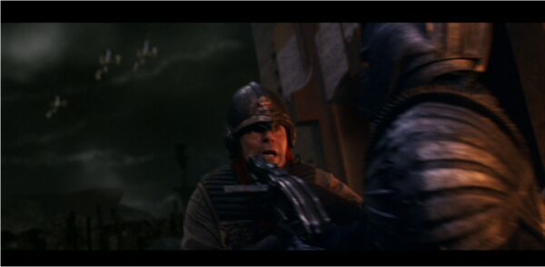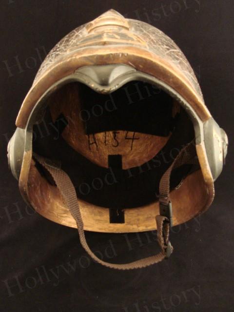 Helmet worn by the Mecca soldiers in The Chronicles of Riddick starring Vin Diesel. The soldiers can be seen at the beginning of the film when Mecca City is being invaded by the Necromongers. The helmet is bronze colored and made of hard resin. It has a chin strap and padding on the inside.