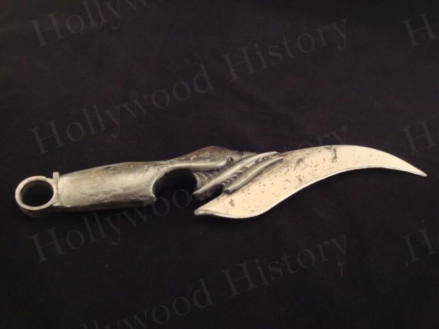 A knife used by Vin Diesel in the SciFi film The Chronicles of Riddick. A sequal to Pitch Black. Vin is seen pulling this knife out of his boot to kill Necromongers as they are trying to escape Crematoria. The knife is made of resin and hard rubber. Measures 13in x 2 in