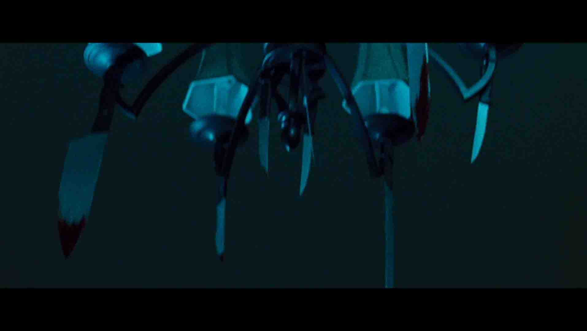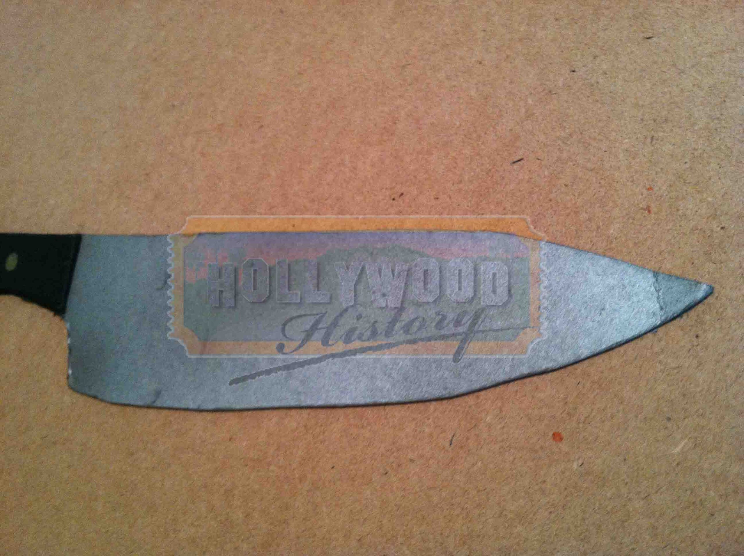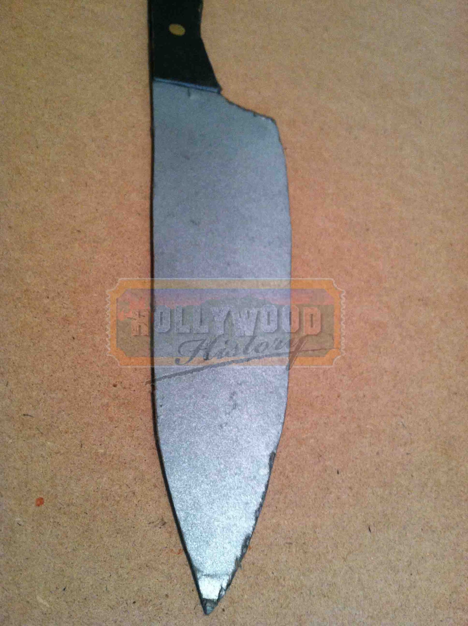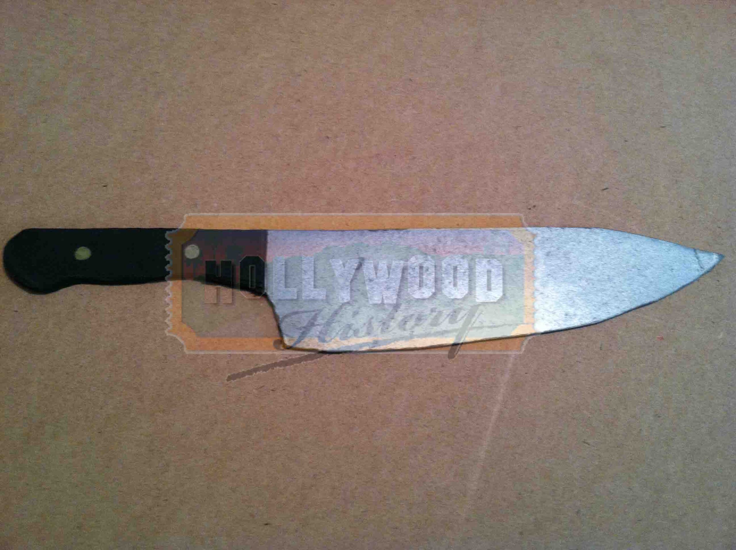 This is a knife from the 2009 horror film The Collector. In the film, Arkin (Josh Stewart) attempts to rob a house only to discover that it’s been booby trapped by a torturous killer, the Collector (Juan Fernandez). Knives were hanging from all the chandeliers in the Chase’s house. Rigged with cables, these chandeliers would fall on victims. In scenes that did not require a slowed close-up cardboard knives like these were used.