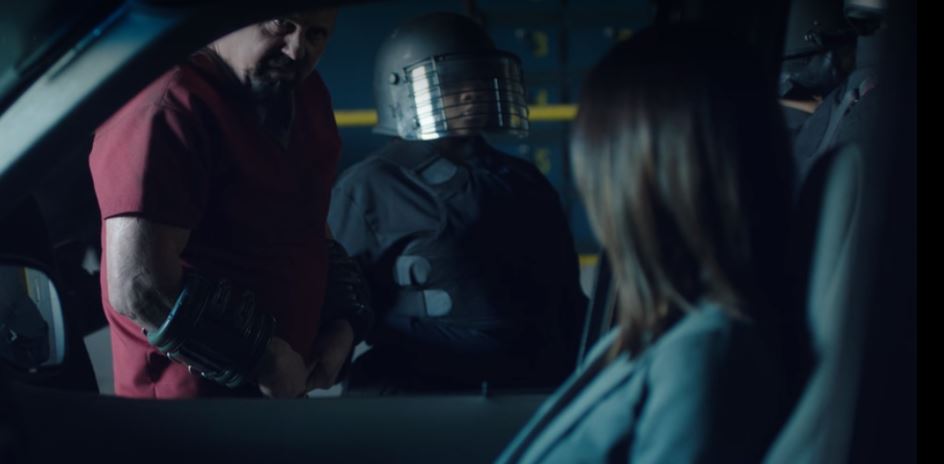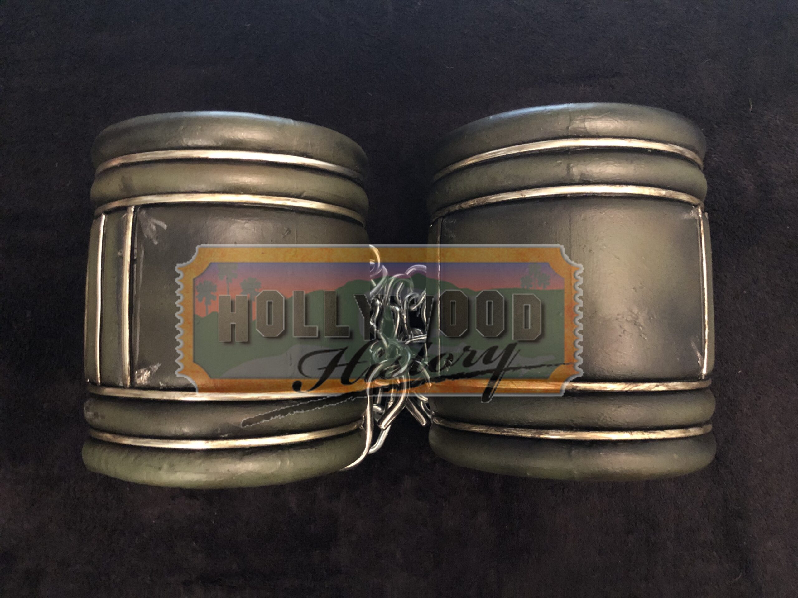 Two guards fighting through a power breakdown inside the secret ‘Death House’ prison must fight to survive ruthless inmates and even supernatural horrors. These gauntlet handcuffs are worn by Sieg (Kane Hodder) to restrain him while he’s in custody and transported around Death House Prison.