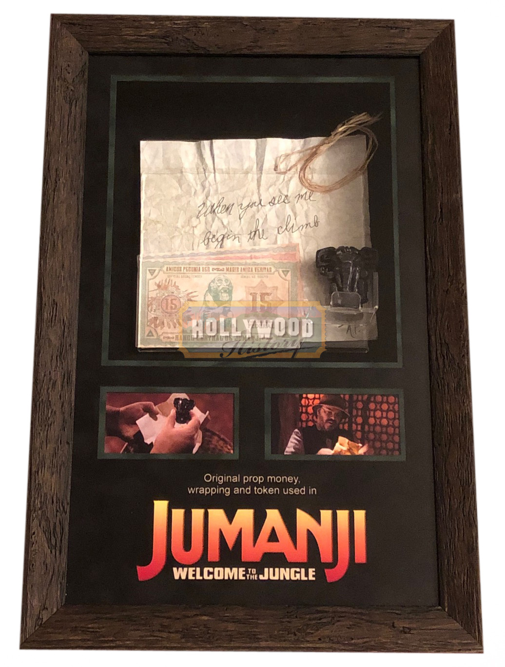 Four teenagers are sucked into a magical video game, and the only way they can escape is to work together to finish the game. From the 2017 fantasy film Jumanji: Welcome to the Jungle, this is the Elephant token and note seen when Spencer (Dwayne Johnson) retrieves the actual elephant token along with a handwritten note about clues not being what they seem and to climb when they see the elephant. The missing Elephant game piece was Alan Parrish’s (Robin Williams) game piece from the original film which was a notable reference to the first film as a tribute to its lead actor Robin Williams. Also in the display are different dominations of money from the Jumanji World.