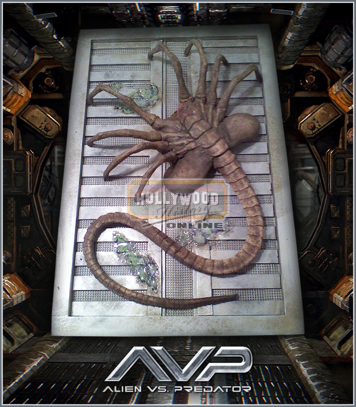 This is a special effects Facehugger used in the 2004 film Aliens vs. Predator also known as AvP. The film adapts the Alien vs. Predator crossover imprint bringing together the eponymous creatures of the Alien and Predator series, a concept which originated in a 1989 comic book. This Facehugger made of foam, was created by Amalgamated Dynamics and features exposed guts to simulate a wound with a special effects pole attachment on the underside for puppeteering.