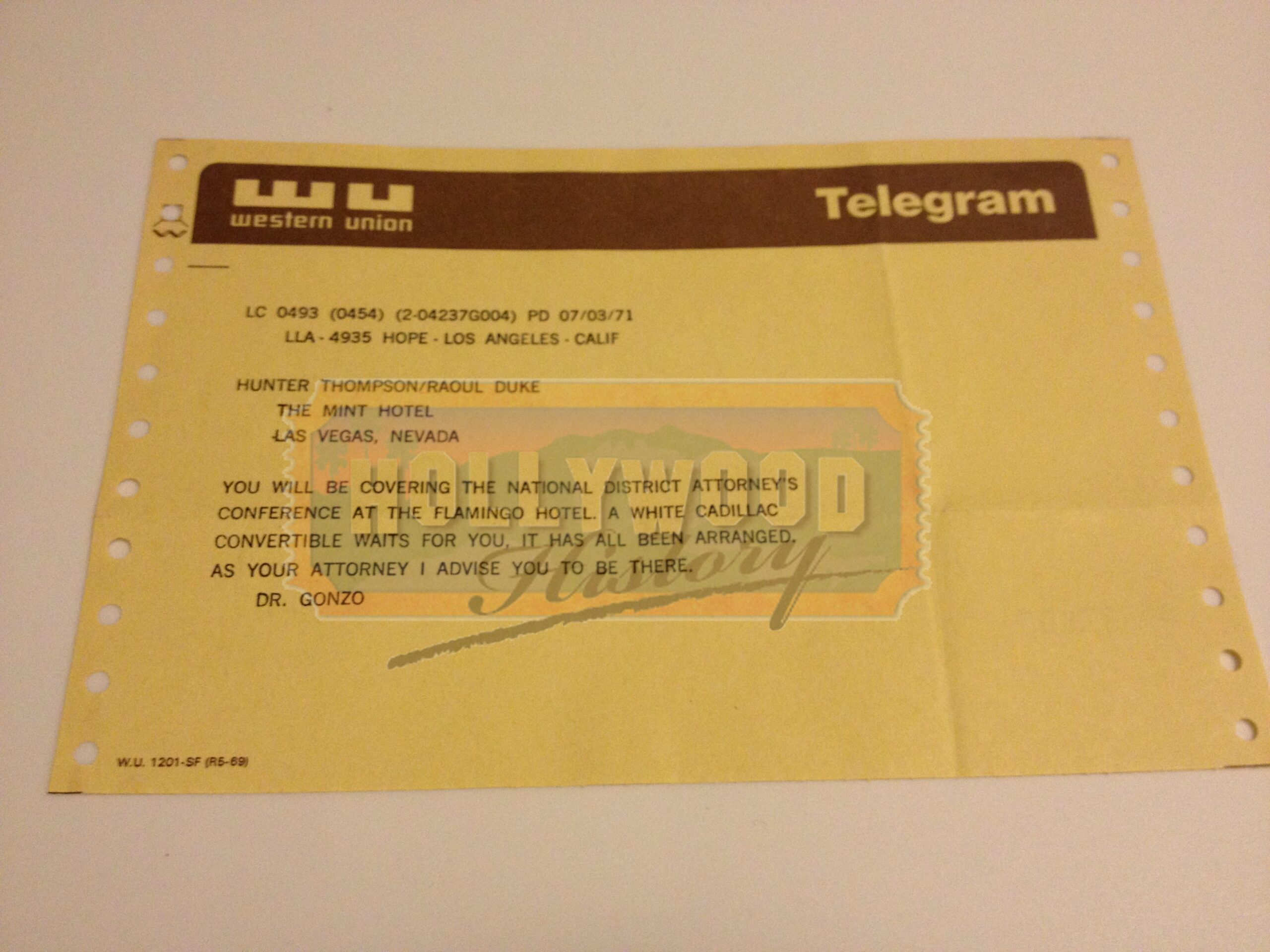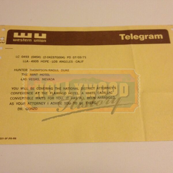 Fear and Loathing in Las Vegas is a 1998 American black comedy film directed by Terry Gilliam, starring Johnny Depp as Raoul Duke and Benicio del Toro as Dr. Gonzo. It was adapted from Hunter S. Thompson’s 1971 novel of the same name. This is the screen used telegram seen in the film when Raoul Duke (Johnny Depp) awakes to a massive room service bill and no sign of Dr. Gonzo (Benicio Del Toro) who had returned to Los Angeles while Duke slept, and attempts to leave town. As he nears Baker, California, a highway patrolman (Busey) pulls him over for speeding and advises him to sleep at a nearby rest stop. Realizing that he is being set up, Duke instead decides to return to Las Vegas and reads this telegram from Gonzo, informing him that he has a suite in his name at the Flamingo Las Vegas so he can cover a District Attorney’s convention on narcotics. The telegram measures 8 ½” wide by 5 ½” tall.
