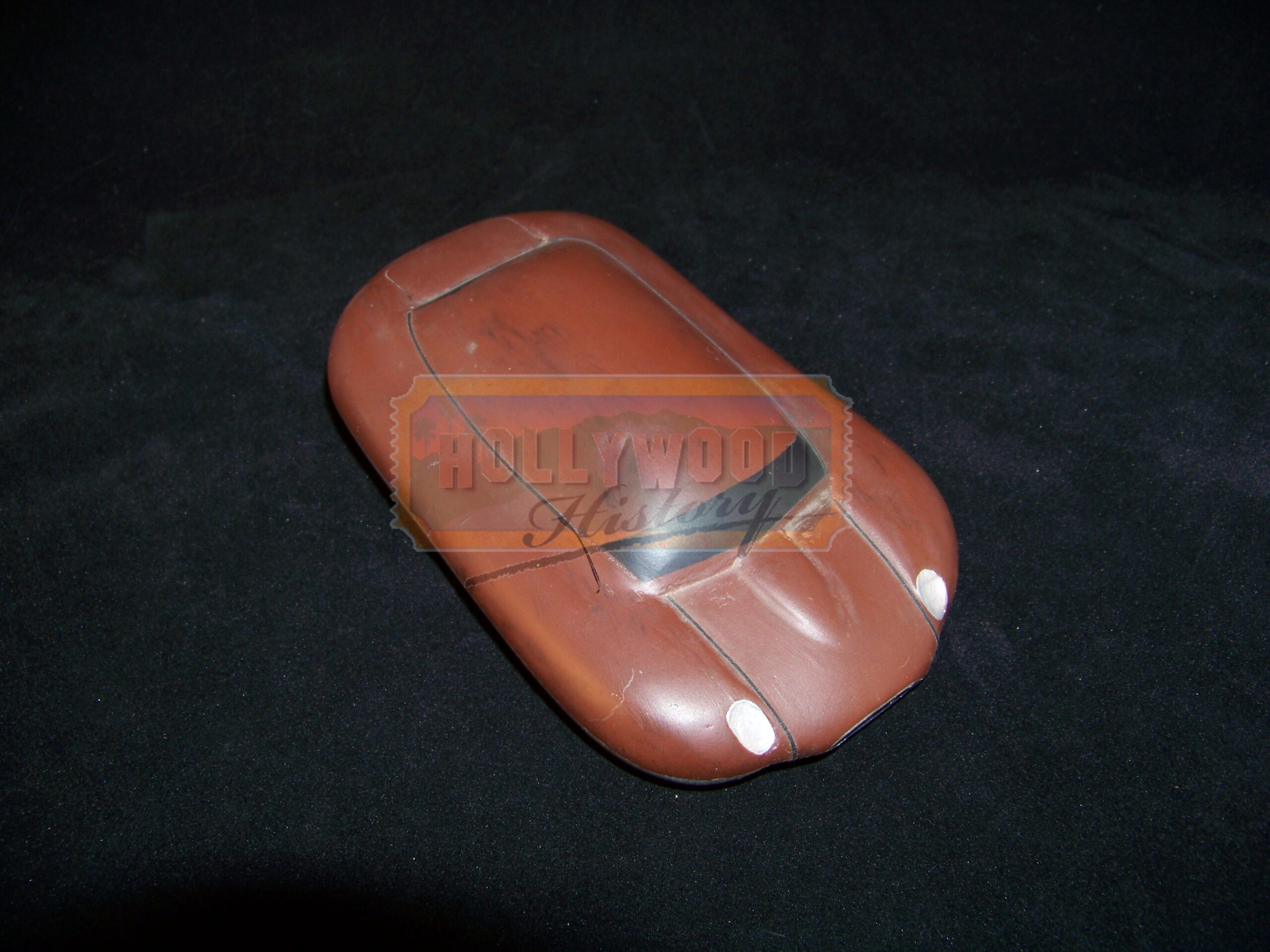 In the 23rd century, Korben Dallas (Bruce Willis), an ex-special forces agent who now practices as a down-and-out cabbie, finds himself caught in a struggle to defy a prophesied Evil from destroying the Earth when a mysterious woman (Milla Jovovich) falls into the back seat of his cab. Pursued by both the government and a powerful magnate enlisted by the forces of Evil (Gary Oldman), the woman is the key to Earth’s salvation, known only as the Fifth Element. This is a miniature red car that can be seen in the futuristic city dwelling that Korben Dallas resides in. It is custom made of resin and overall it is in great screen used condition with detailed paint of dirt, rust and grime. There is also a hole drilled in the bottom where a stand would be inserted for filming.