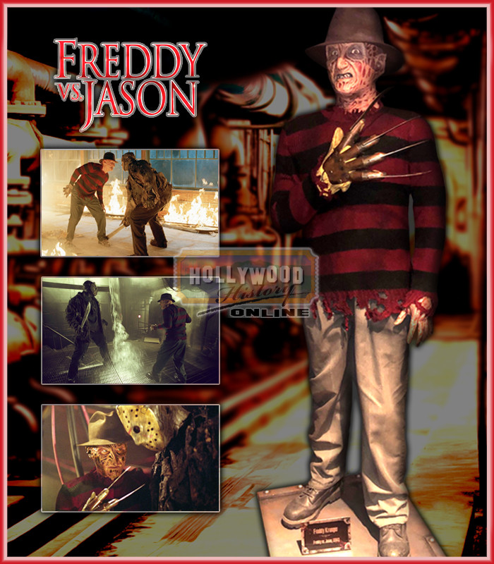 Freddy Krueger and Jason Voorhees return to terrorize the teenage population except this time; they’re also out to get each other. This is a hero screen used Freddy Krueger (Robert Englund) character display used in the 2003 horror showdown, Freddy vs. Jason. One of the most recognizable horror costumes in cinema, this display consists of his hero costume and his hero metal glove.