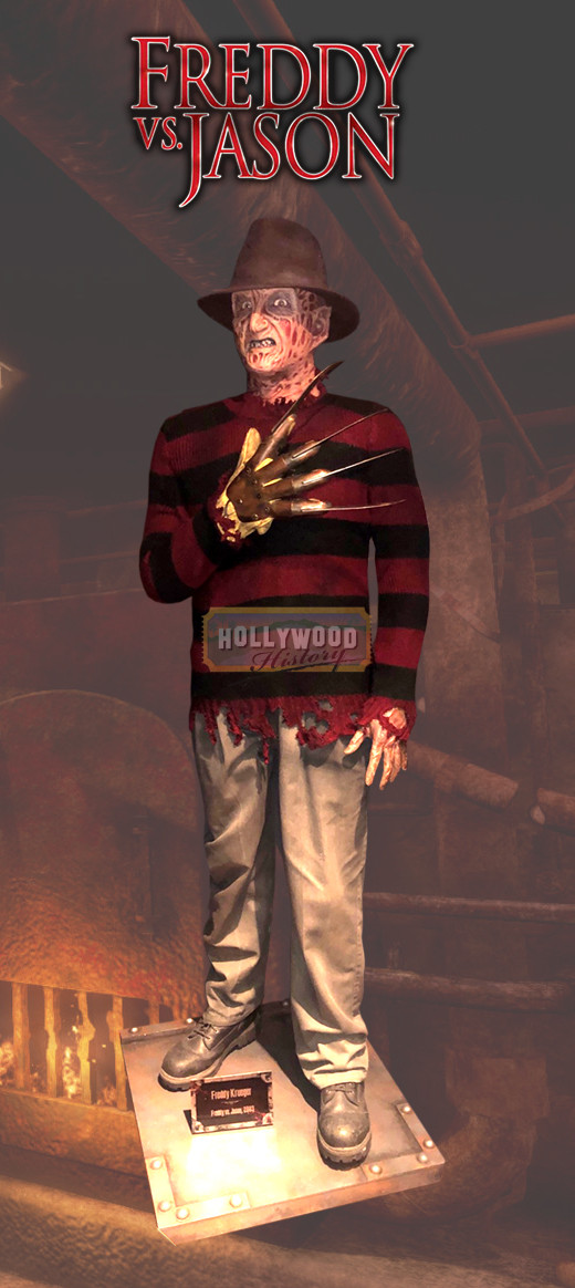 Freddy Krueger and Jason Voorhees return to terrorize the teenage population except this time; they’re also out to get each other. This is a hero screen used Freddy Krueger (Robert Englund) character display used in the 2003 horror showdown, Freddy vs. Jason. One of the most recognizable horror costumes in cinema this display is comprised of his hero costume and his hero metal glove.