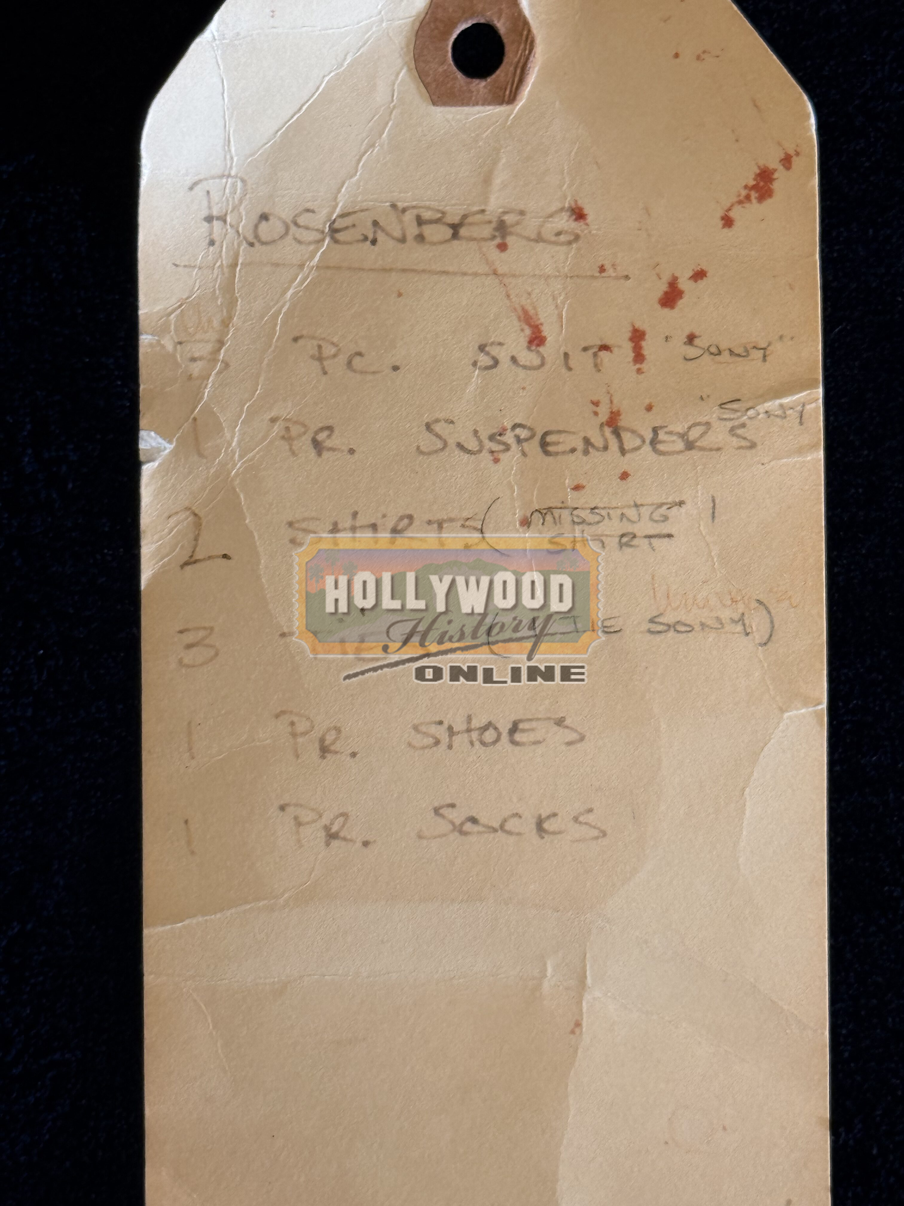 A pair of original production costume socks that Gentle Rosenberg (Mike Nussbaum) wore in Barry Sonnenfeld’s hit 1997 sci-fi comedy film, Men in Black. The Arquillian prince wore a mechanical human body named Gentle Rosenberg. He was dressed in a 3-piece suit and wore these socks when The Bug (Vincent D’Onofrio) attacked him while he was having lunch with a fellow Arquillian. The pair of brown socks includes a production tag listing Rosenberg’s costume components. The tag shows production use and age and the socks remain in good condition and perfect to help complete a costume.