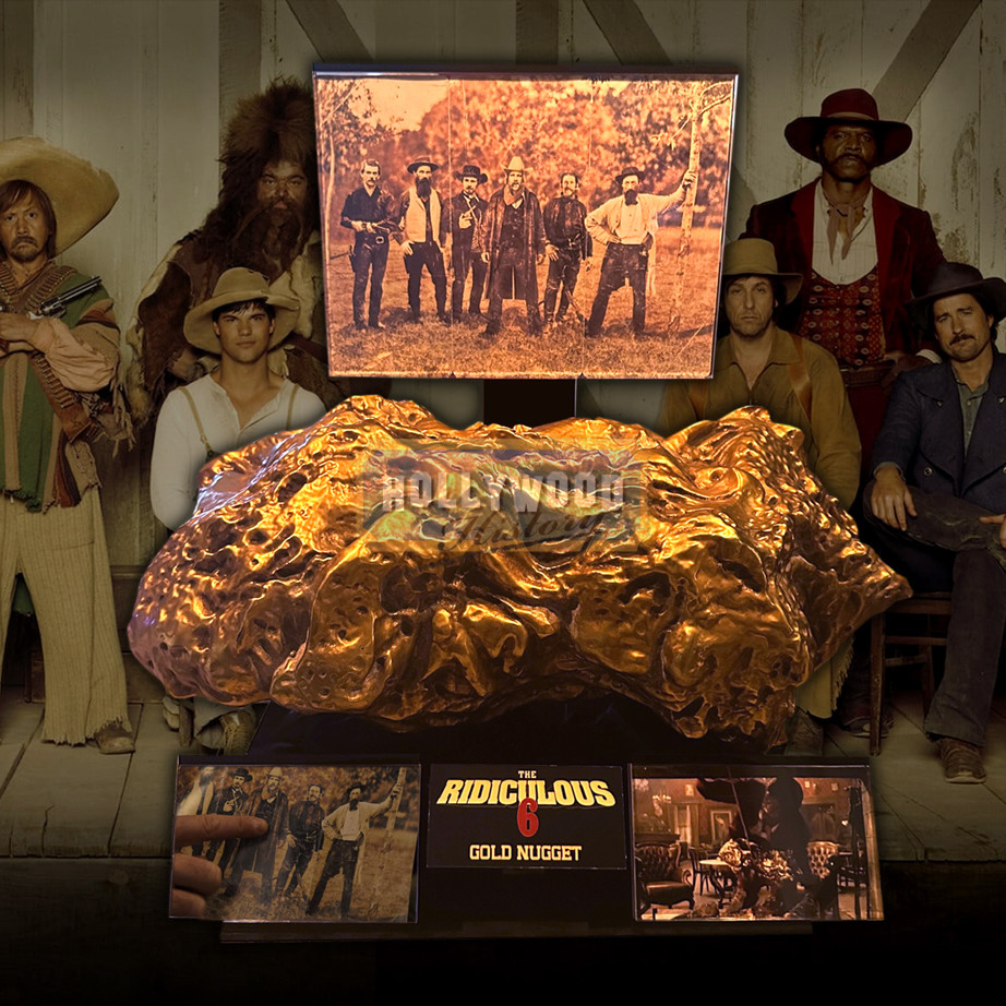 An outlaw who was raised by Native Americans discovers that he has five half-brothers. Together the men go on a mission to find their wayward, deadbeat dad. From the Happy Madison film The Ridiculous 6, this is the screen matched gold nugget seen inside “The Golden Nugget” that the gang needs to be able to pay off the ransom and was the only one that was used. Above the Gold Nugget on the display is Danny’s (Luke Wilson) screen matched vintage picture he carries around and shows multiple times throughout the film, looking his dad.