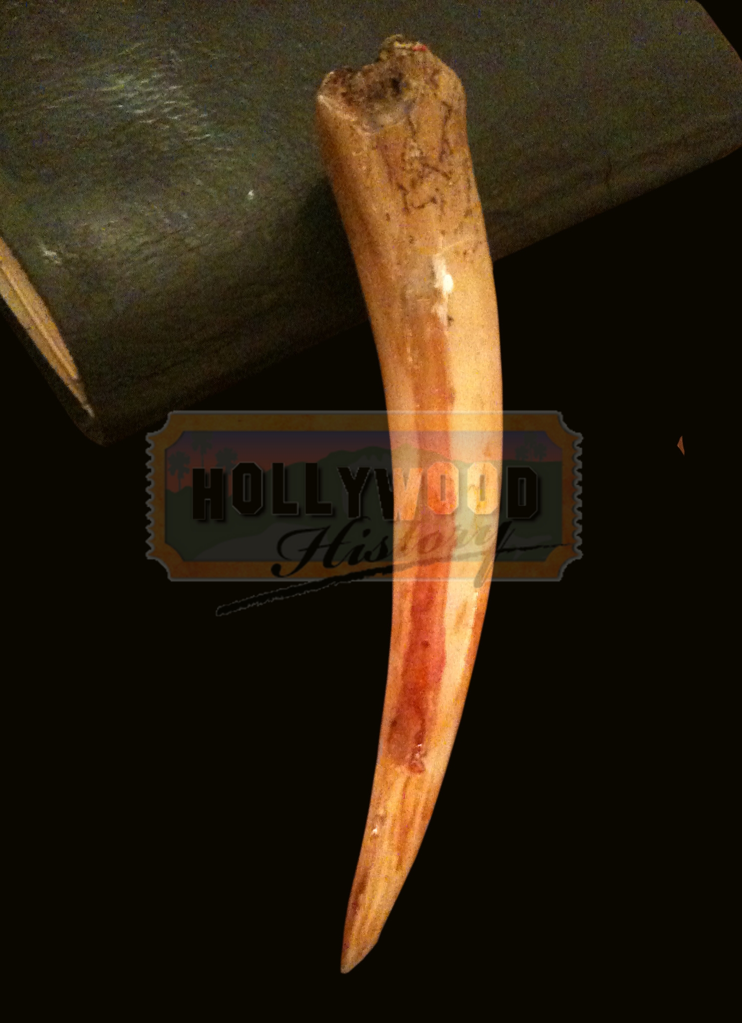 Harry Potter and the Chamber of Secrets is the second installment in the Harry Potter film series, directed by Chris Columbus. In the film Tom Marvolo Riddle appears, explaining that he is a memory preserved in the diary. Harry learns that Tom is Slytherin’s Heir and is Lord Voldemort in his teenage form. Riddle sends the basilisk to kill Harry and after Harry aquires the Sword of Godric Gryffindor, he impales the basilisk in the roof of the mouth killing it as a fang pierces his arm. Harry then destroys Tom Riddle by piercing the diary with the fang from the Basilisk. This is the special effects diary and hero Basilisk tooth used in the final scenes and two very important pieces from the film. There is still evidence of fake blood that was pumped through the fang and tooth to give the effect of it bleeding when stabbed by Harry Potter.