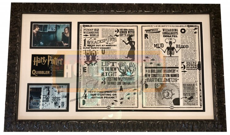 A page of “The Quibbler” magazine featured in the Warner Brothers film Harry Potter Deathly Hallows Part I. The Quibbler, marketed as The Wizarding World’s Alternative Voice, is a wizarding tabloid published and edited by Xenophilius Lovegood. When Harry, Hermione and Ron go to Mr Lovegood’s house to ask him about the charm on his necklace; this page can be seen covering the window behind Hermione and Ron and has been professionally framed in mint condition.