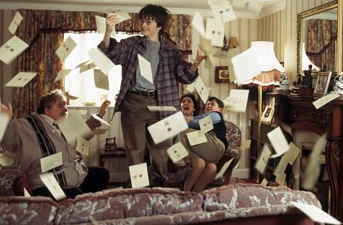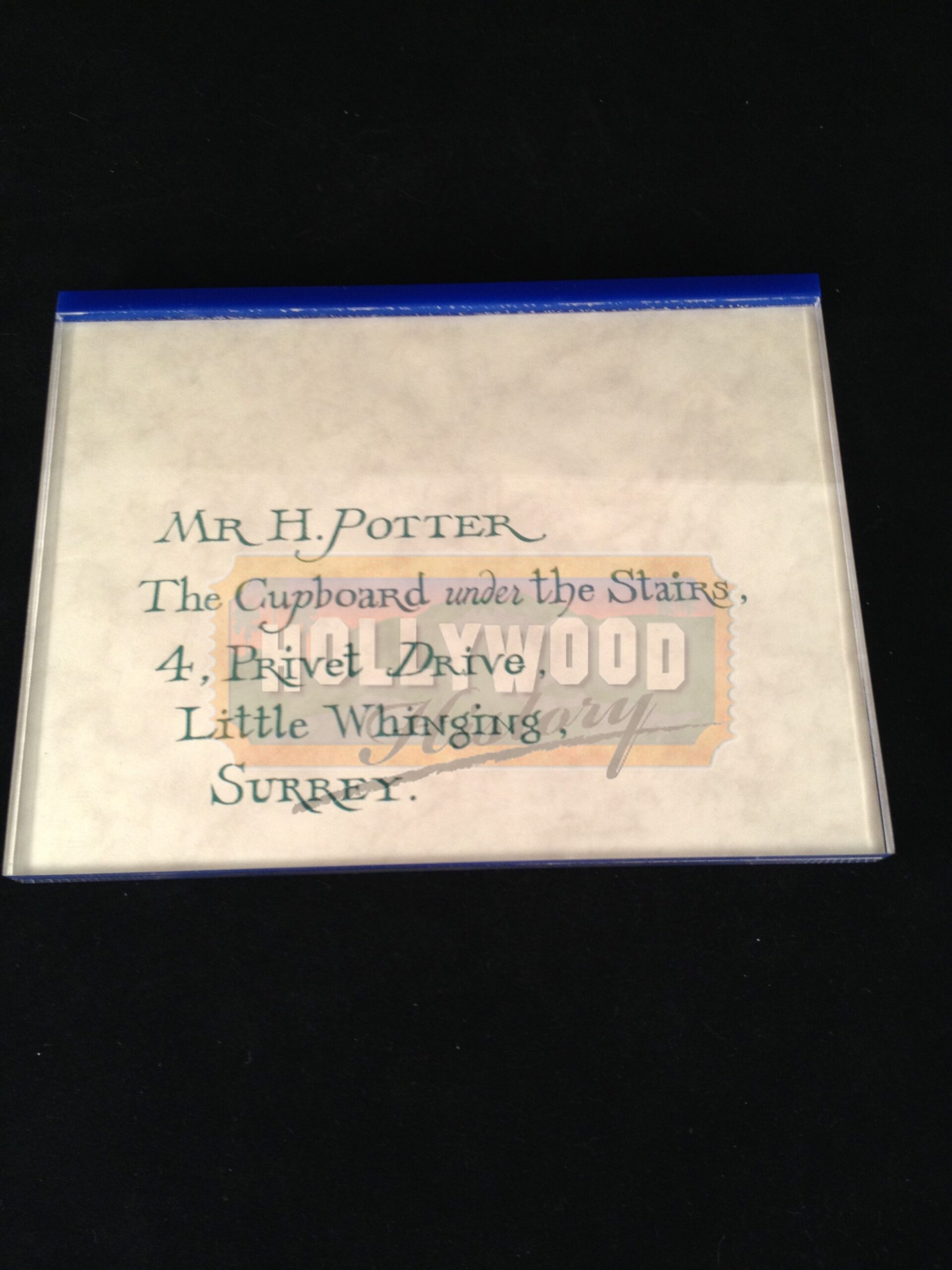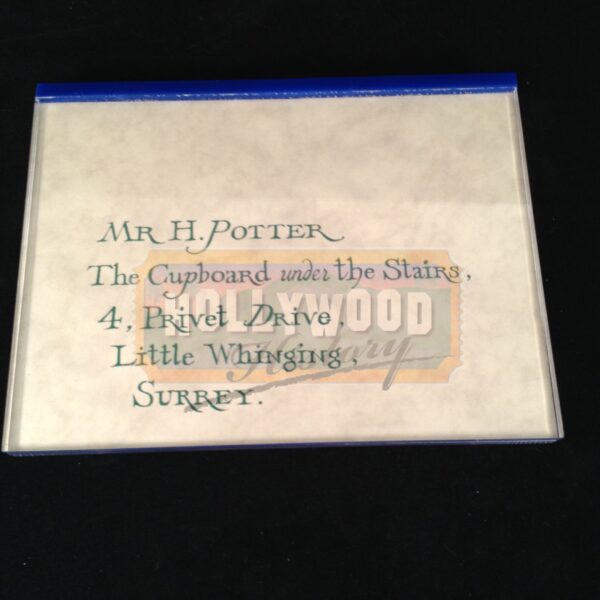 Harry Potter (Daniel Radcliffe) has spent the first ten years of his life living under the stairs in the house of his Aunt Petunia and Uncle Vernon, who generally dislike him. Then, one day, a giant, named Hagrid, comes to him with an invitation to study at Hogwarts School of Witchcraft and Wizardry. Harry soon discovers that there are two worlds: one is the dreary world of the Muggles where he’s grown up, and the other is one of magic and fantasy, and it’s the latter in which he’s destined to live. This is one of the envelopes that were flying through the air in Harry’s house. The envelope has a printed seal on the back in order to keep the prop envelopes light so they would fly around the room. Only a couple of close up letters had the real wax stamp on the back. This piece will also include an acrylic “case” for the letter to sit inside to help prevent damage and protect the letter.