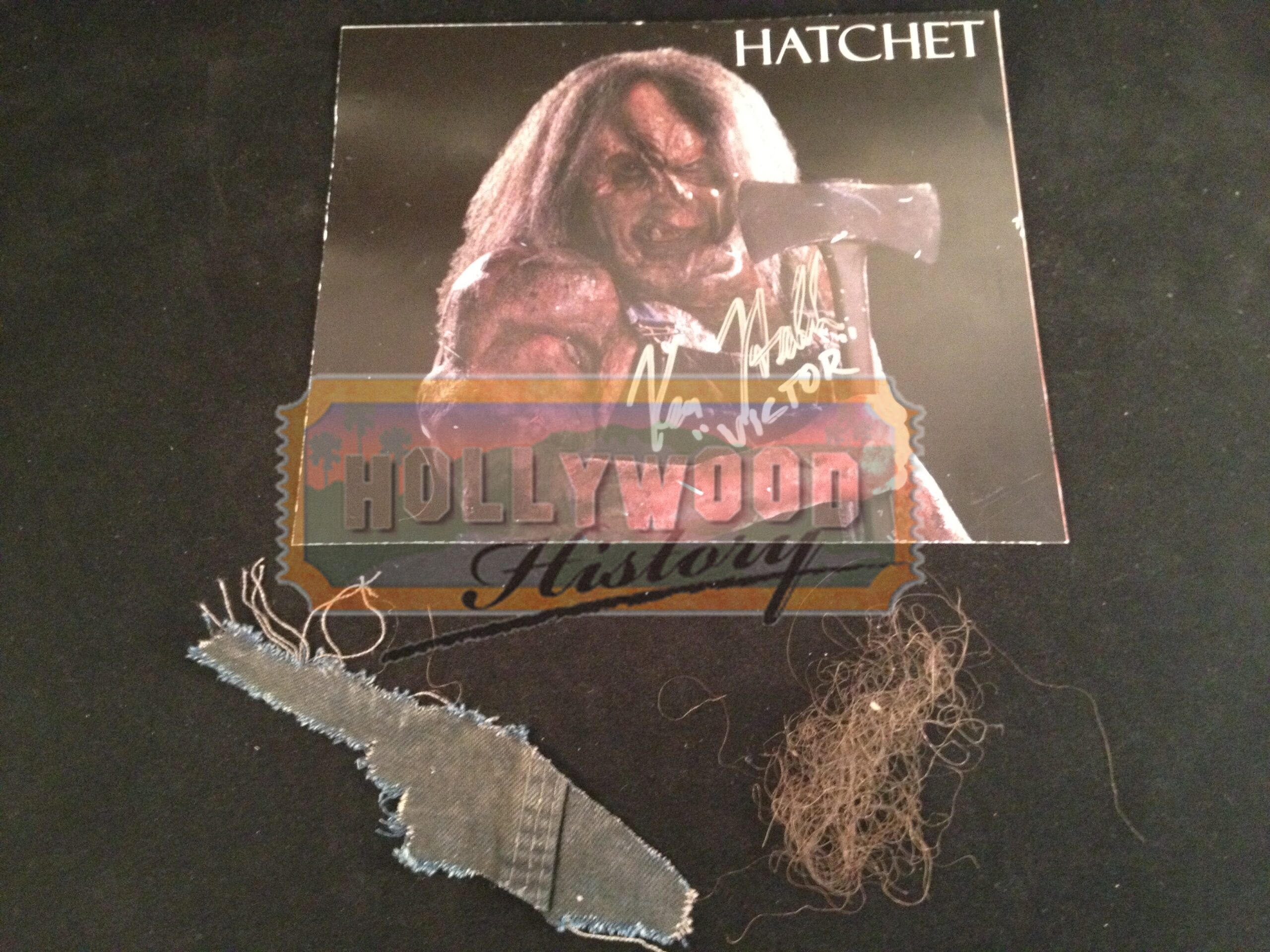 Hatchet is a 2006 American slasher film written and directed by Adam Green. The films follows a motley crew of tourists that embark on a boat ride of the haunted Louisiana bayous where they learn the terrifying tale of local legend “Victor Crowley” (Kane Hodder); a horribly disfigured man who was tragically and accidentally killed with a hatchet by the hands of his own father. But when the boat sinks and the ghost story turns out to be real, the group tries desperately to escape the swamp with their lives. This lot includes a signed picture of Kane Hodder as Victor Crowley, a piece of his hair & overalls both used in the film.