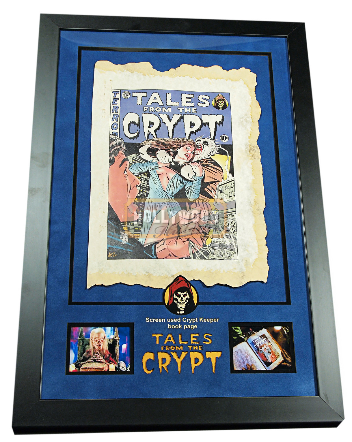 This is a hero book page from the infamous Crypt Keepers storybook page used in the 1989-1996 television series, Tales from the Crypt. This page can be seen in the opening scenes of season 7, episode 8 as the Crypt Keepers opens his heavy leather bound book revealing a comic book style image of the nights upcoming story, “Report from the Grave.”