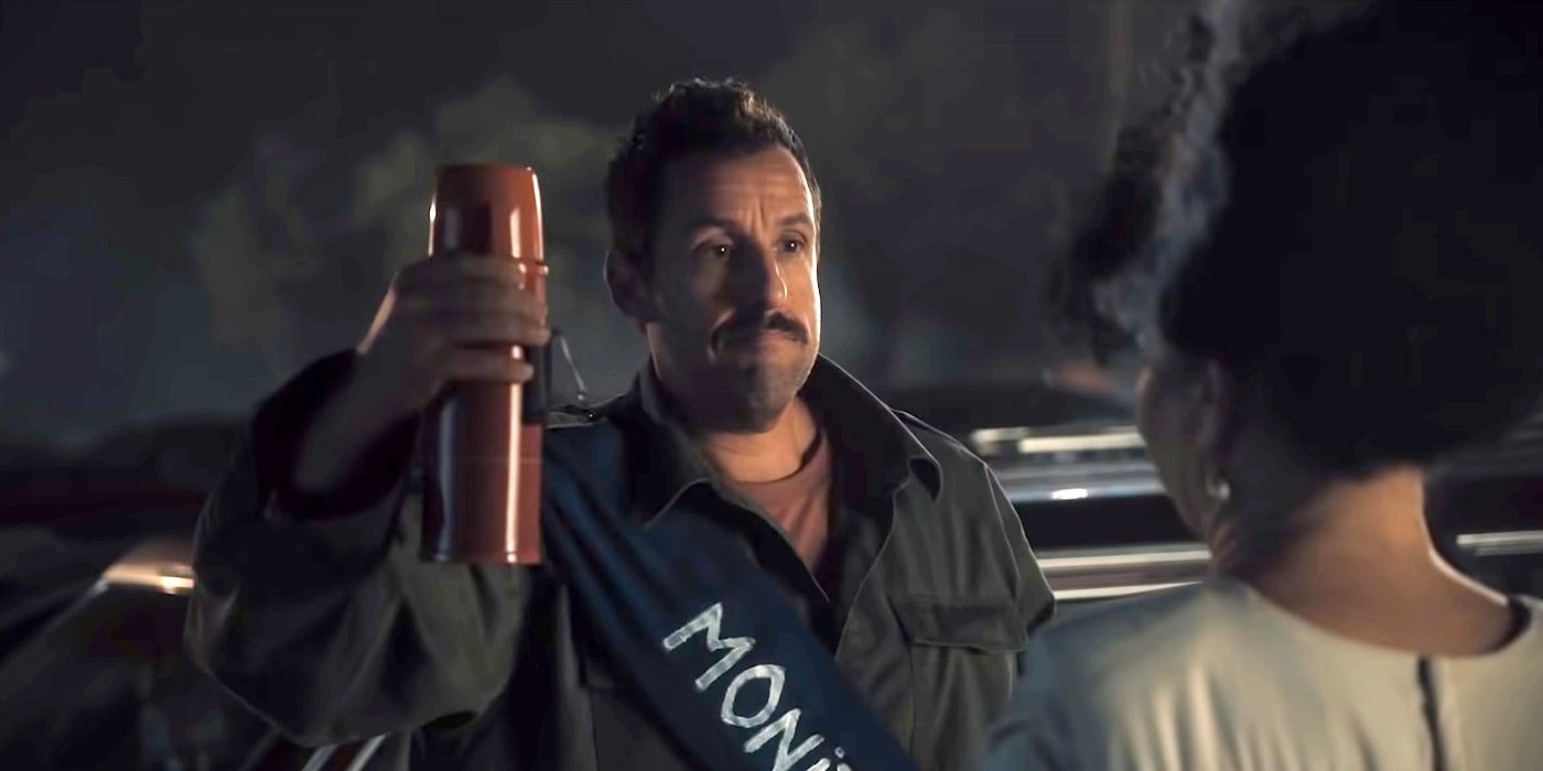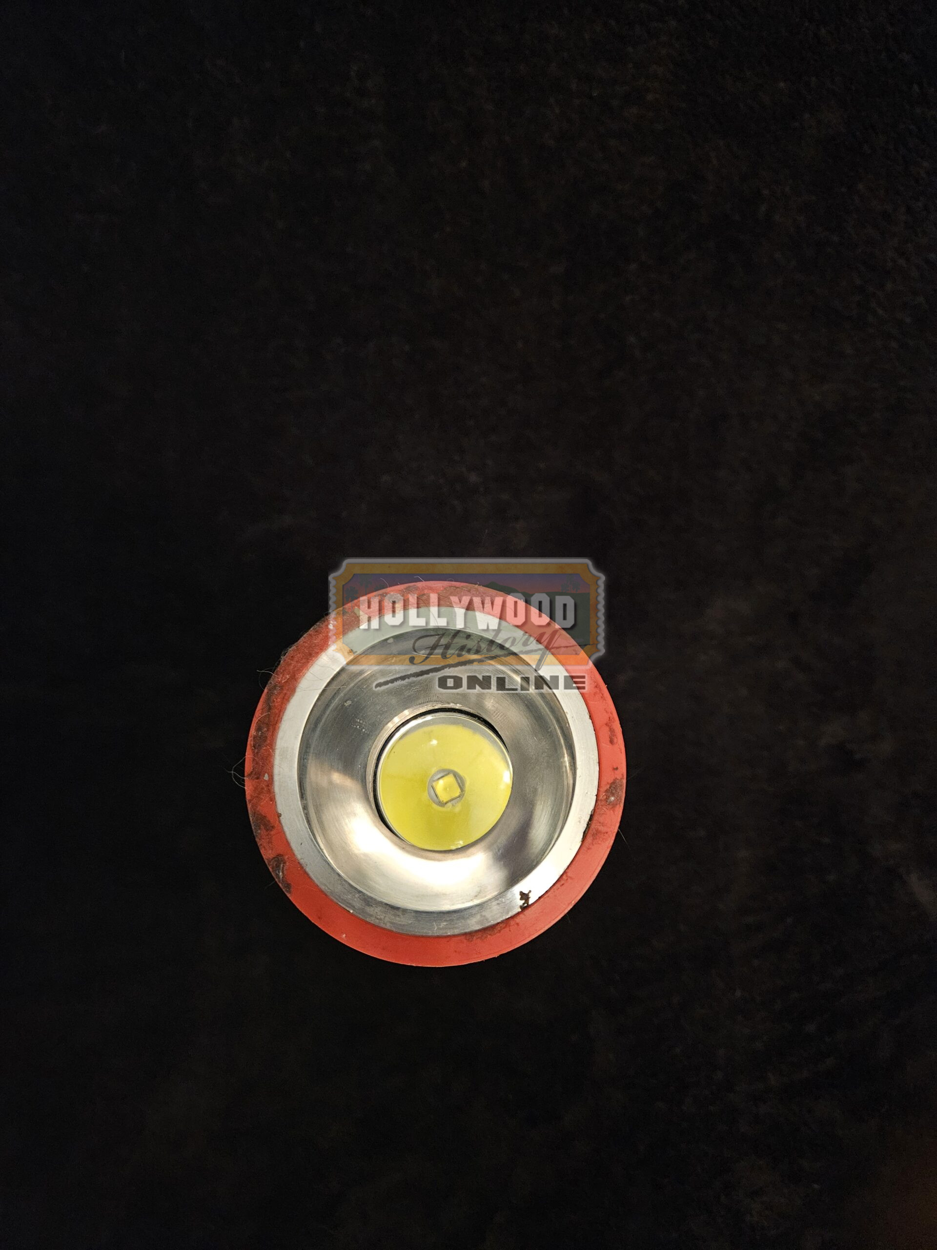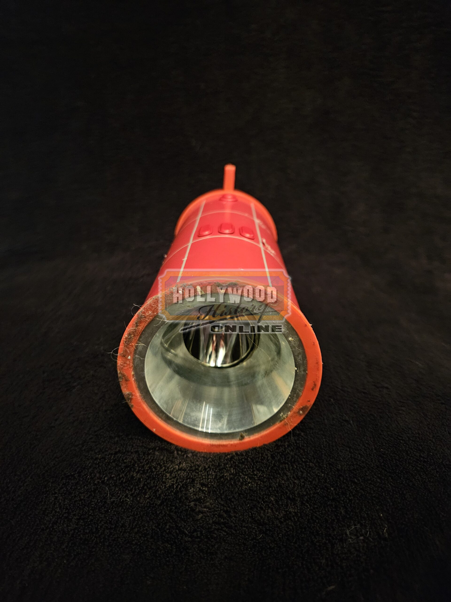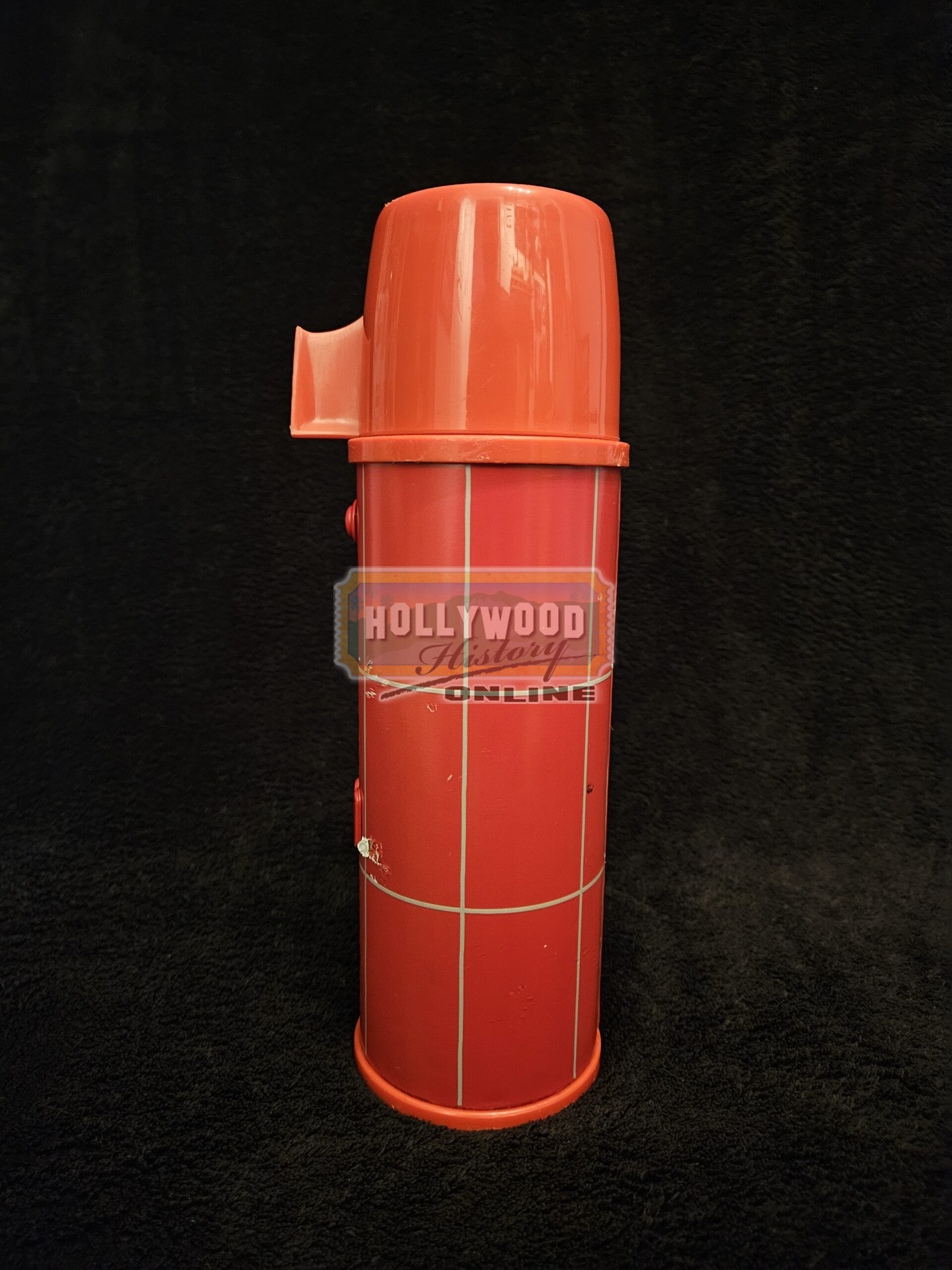 Is it a bird? Is it a plane? From the Adam Sandler film Hubie Halloween, it’s Hubie’s gravity, physics and sense-defying Swiss-army thermos! This is screen used flashlight version of Hubie’s Swiss-Army Thermos. This thermos had an LED flashlight inside that can be charged and with a button on the side of the thermos can be cut on and off. Once inside Lambert’s house, Hubie falls into the pitch-black basement. He quickly turns a light on that comes from his thermos, making it an effective flashlight for his adventure. This particular thermos was also the one used anytime you see with the flashlight style thermos in promotion material and on the film’s poster.