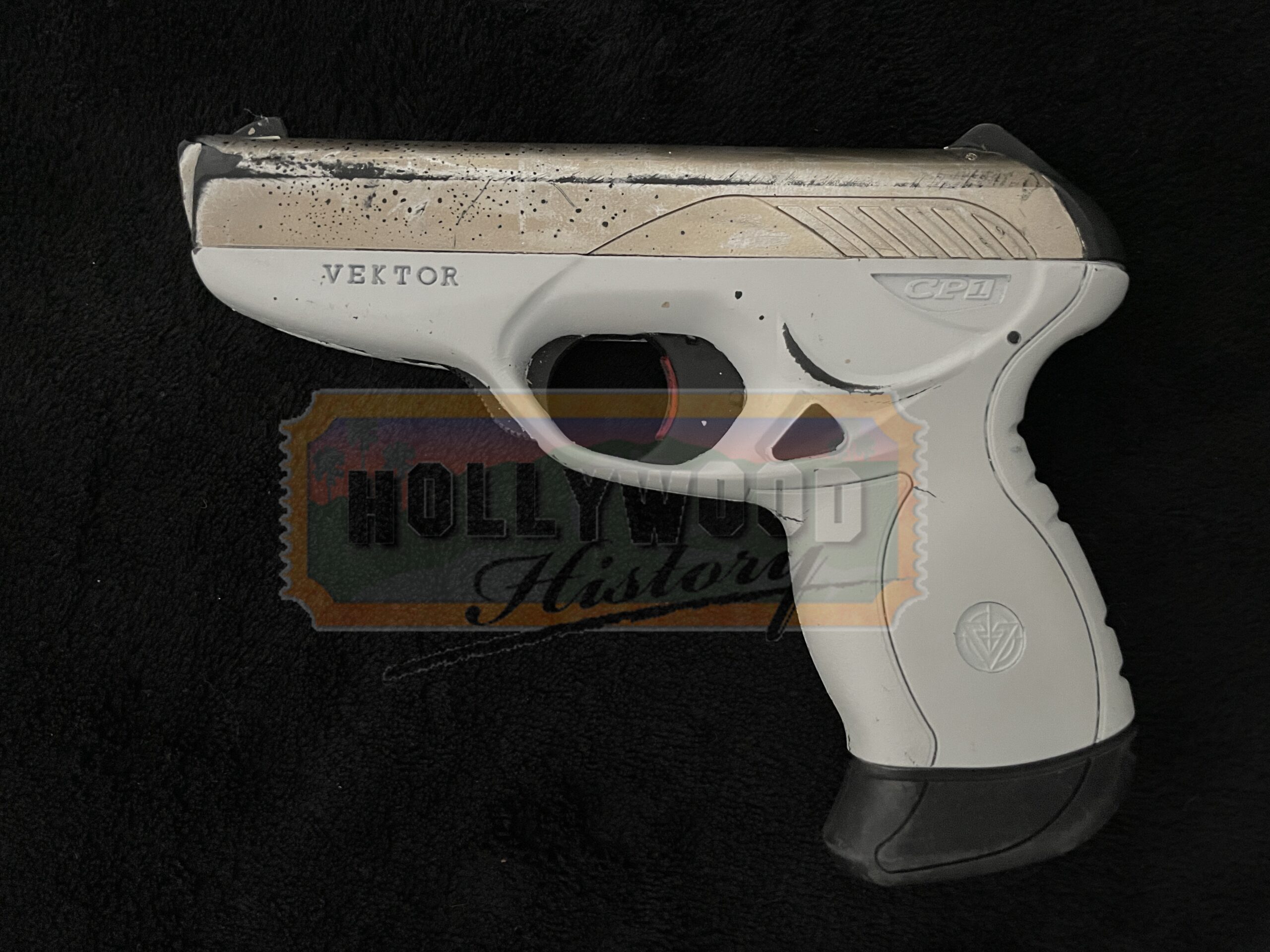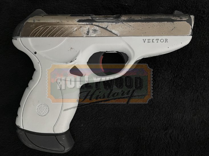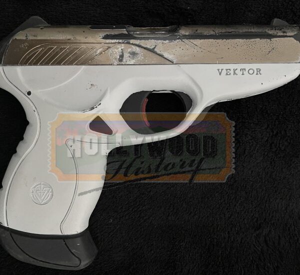Katniss and a team of rebels from District 13 prepare for the final battle that will decide the fate of Panem. A Peackeeper’s pistol used in the Hunger Games series. Unarmed in the first film, the Peacekeepers become increasingly intimidating and wield weapons beginning with Catching Fire. Peacekeepers wear their pistols in a holster that is strapped around the thigh. This pistol is made from a dense urethane and is cast from a Vektor CP-1. Half of the pistol is painted white while the rest is painted silver to resemble the appearance of real metal. This pistol shows some signs of wear such as scuffs to the paint but remains in overall good condition.