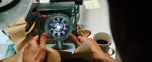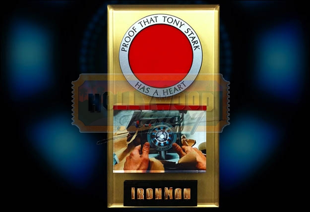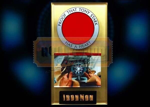 An engraved ring of Pepper Pott’s gift to Tony Stark from the 2008 epic Marvel movie Iron Man. After Tony Stark (Robert Downey Jr) replaces his rudimentary unit in his chest for a more perfected model, Pepper Potts (Gwyneth Paltrow) builds it into a display with one of these engraved rings around the outside to present to Tony as a gift, and later in a moment of dire need he smashes the display to access it. This was one of several made when the action had to be repeated when Tony breaks apart the gift to get the unit out in case of damage. The metallic grey acrylic ring has the words “Proof That Tony Start Has A Heart” engraved in black, and measures approximately 11cm (4.25”) across.