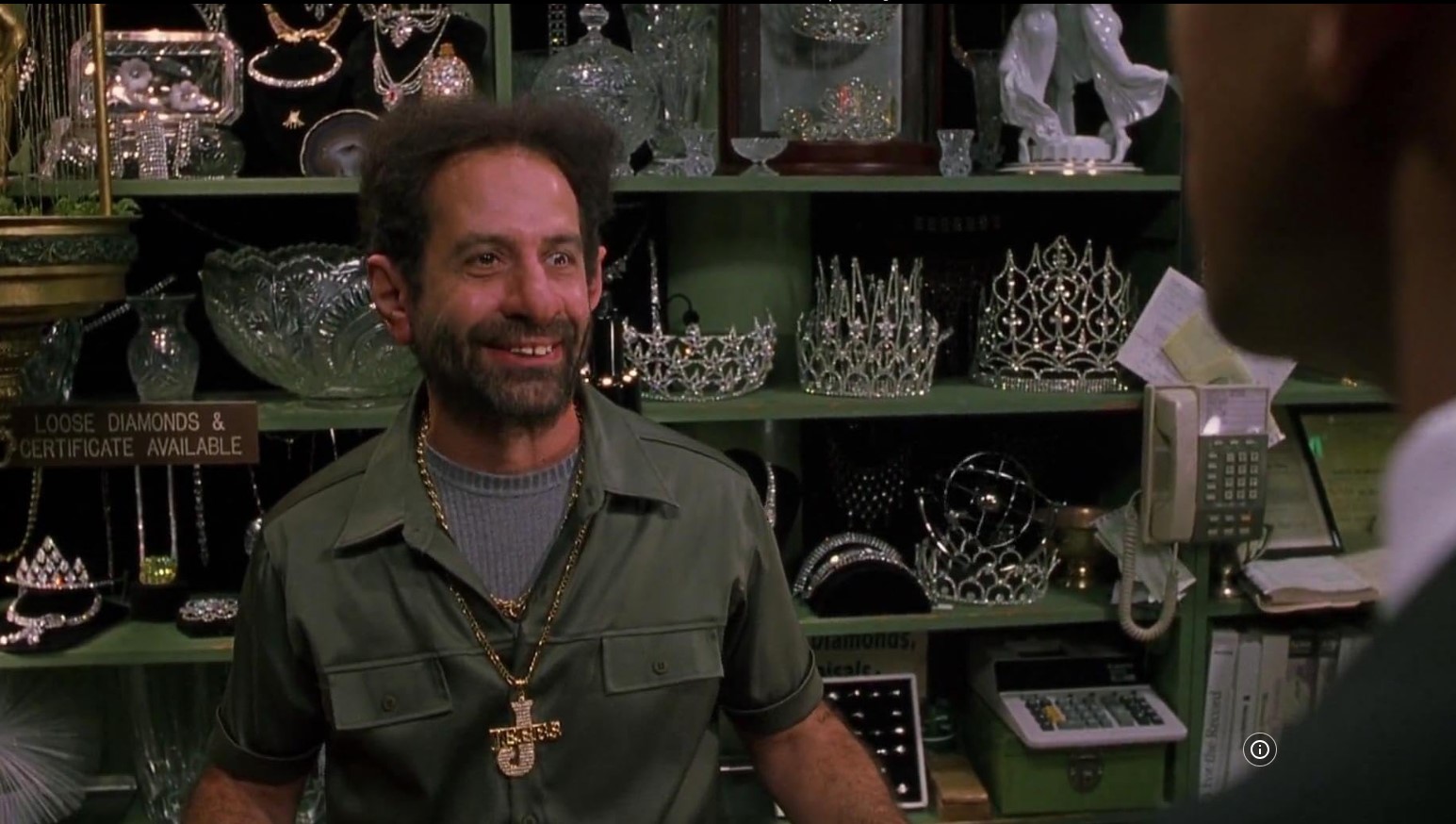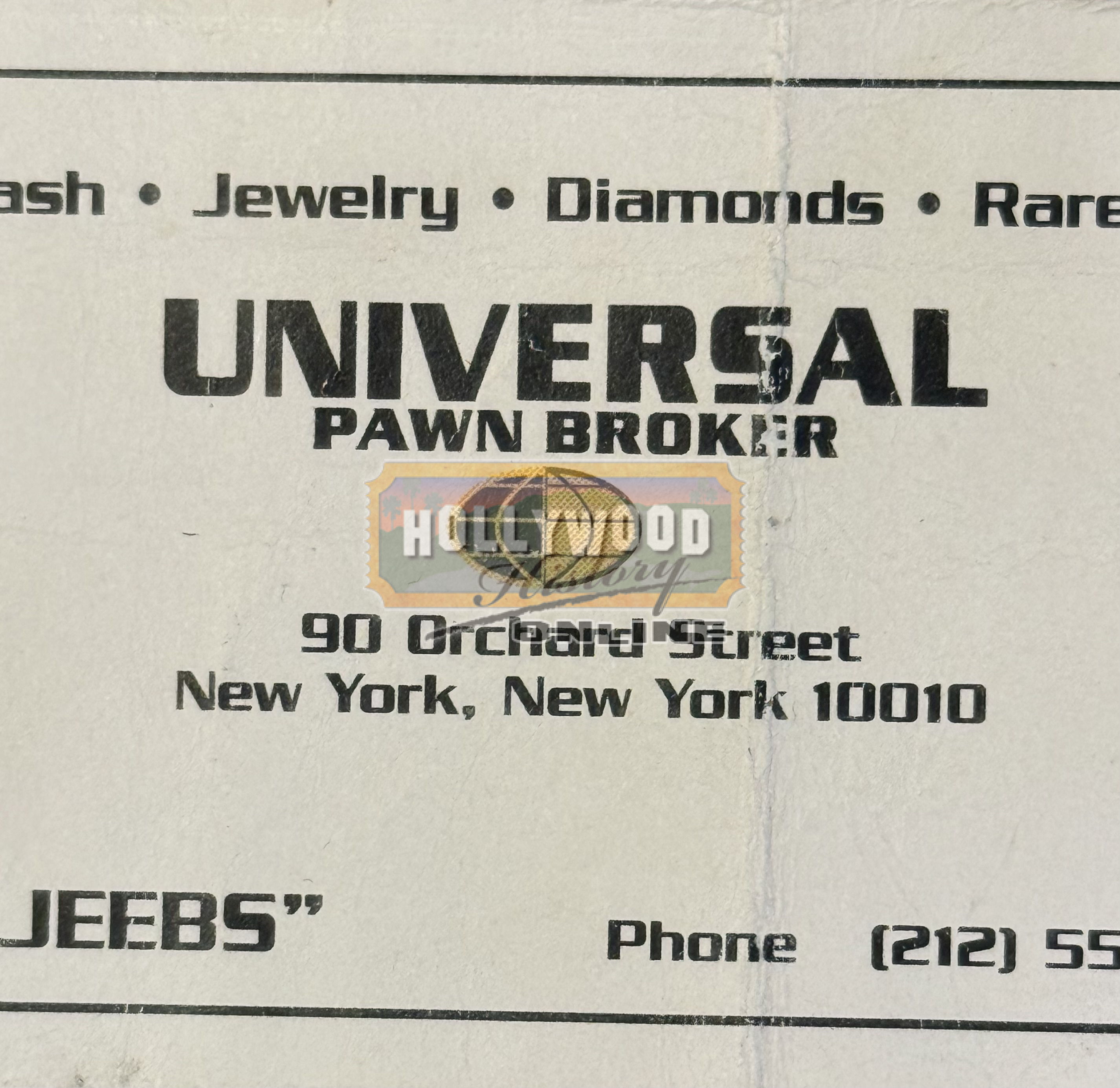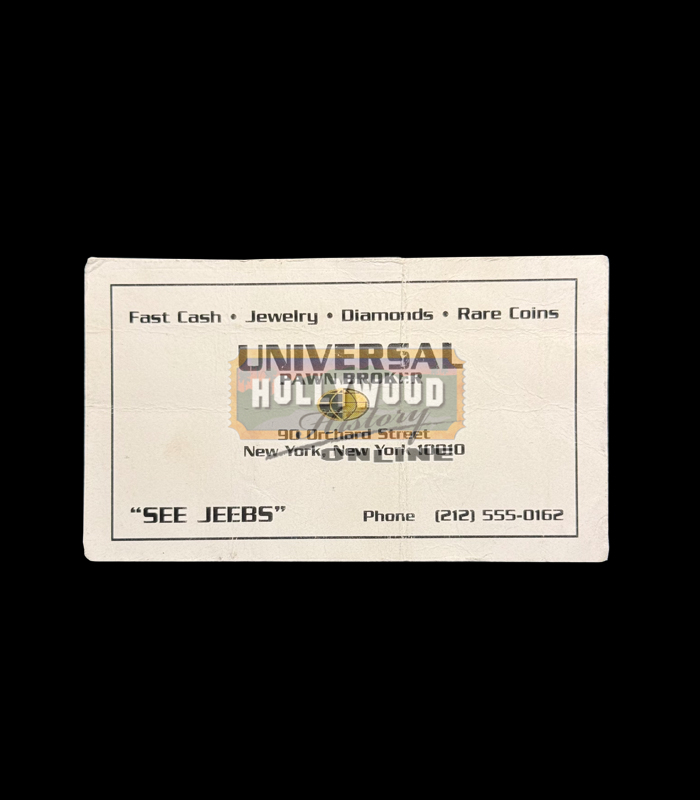From Barry Sonnenfelds’s sci-fi hit film Men in Black, this is Jack Jeebs (Tony Shalhoub) panw shop business card. Jeebs is a shady alien masquerading as a NYC pawnshop owner who illegally deals in alien technology and weaponry. Agents K and J visit his shop to investigate a weapon and K shoots off Jeebs’ head to make him talk revealing his alien anatomy.