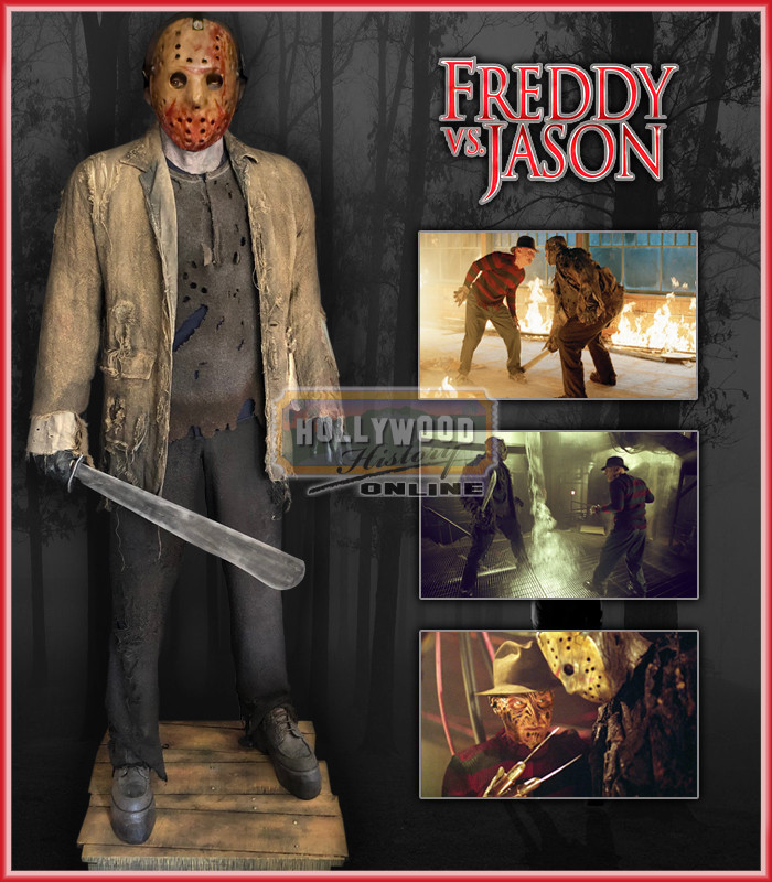 Freddy Krueger and Jason Voorhees return to terrorize the teenage population except this time; they’re also out to get each other. This is a hero screen used Jason Voorhees (Ken Kirzinger) character display used in the 2003 horror showdown, Freddy vs. Jason. One of the most recognizable horror costumes in cinema, this display consists of his hero costume, mask and his hero metal machete.