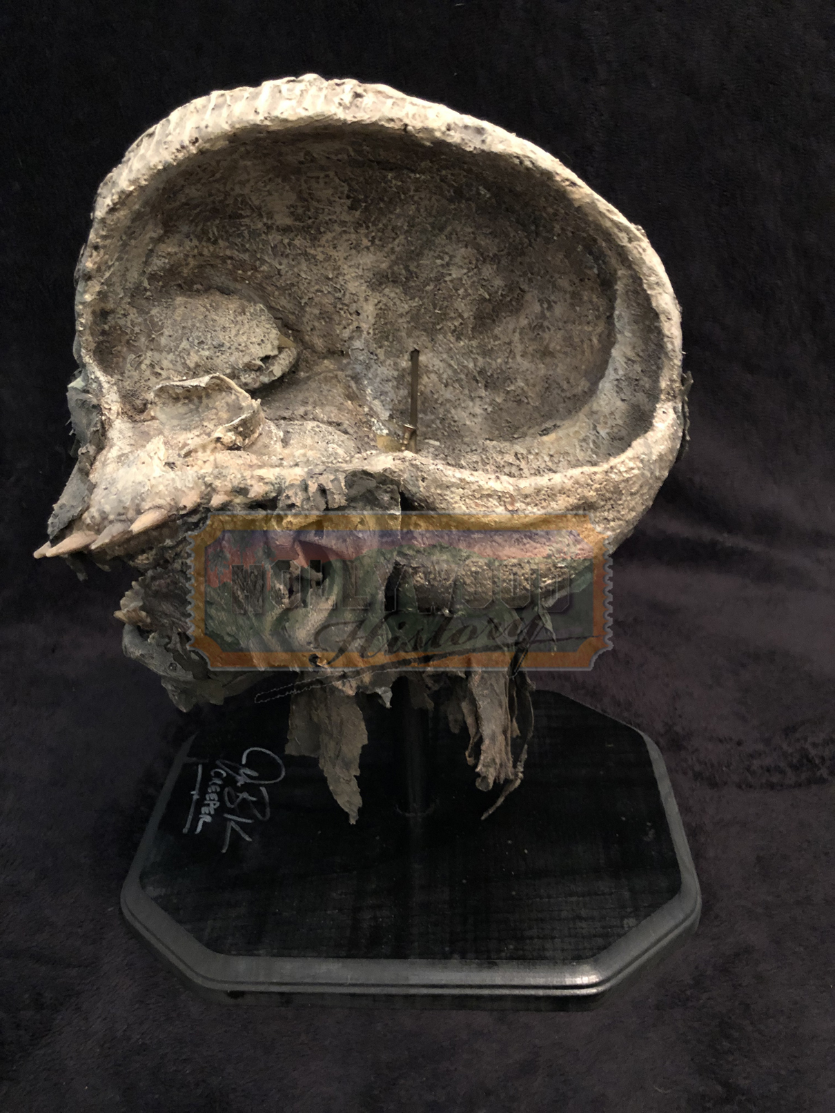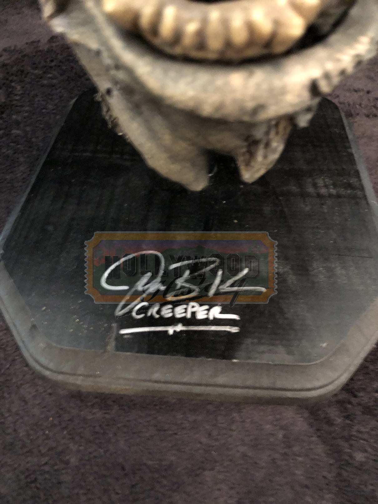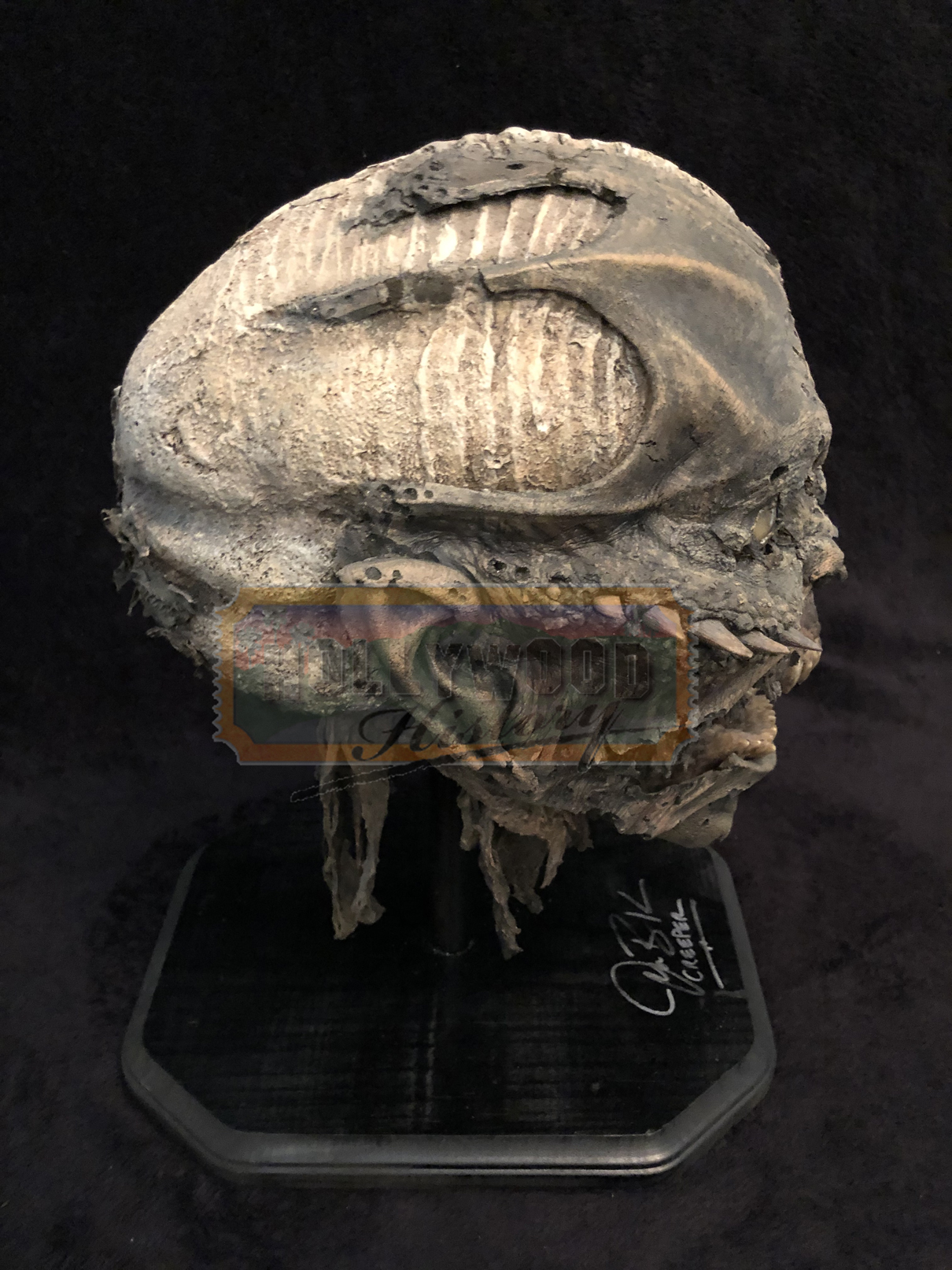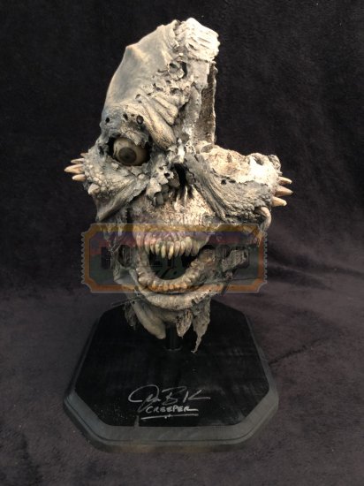 Set a few days after the original, a championship basketball team’s bus is attacked by The Creeper, the winged, flesh-eating terror, on the last day of his 23-day feeding frenzy. From the 2003 horror film, Jeepers Creepers 2 this is the screen used “Throwing Head” seen when the Creeper is stabbed with the Javelin, then removes his damaged head and throws it before regrowing another. The base of the display was also signed by Jonathan Breck, the actor who portrayed The Creeper.