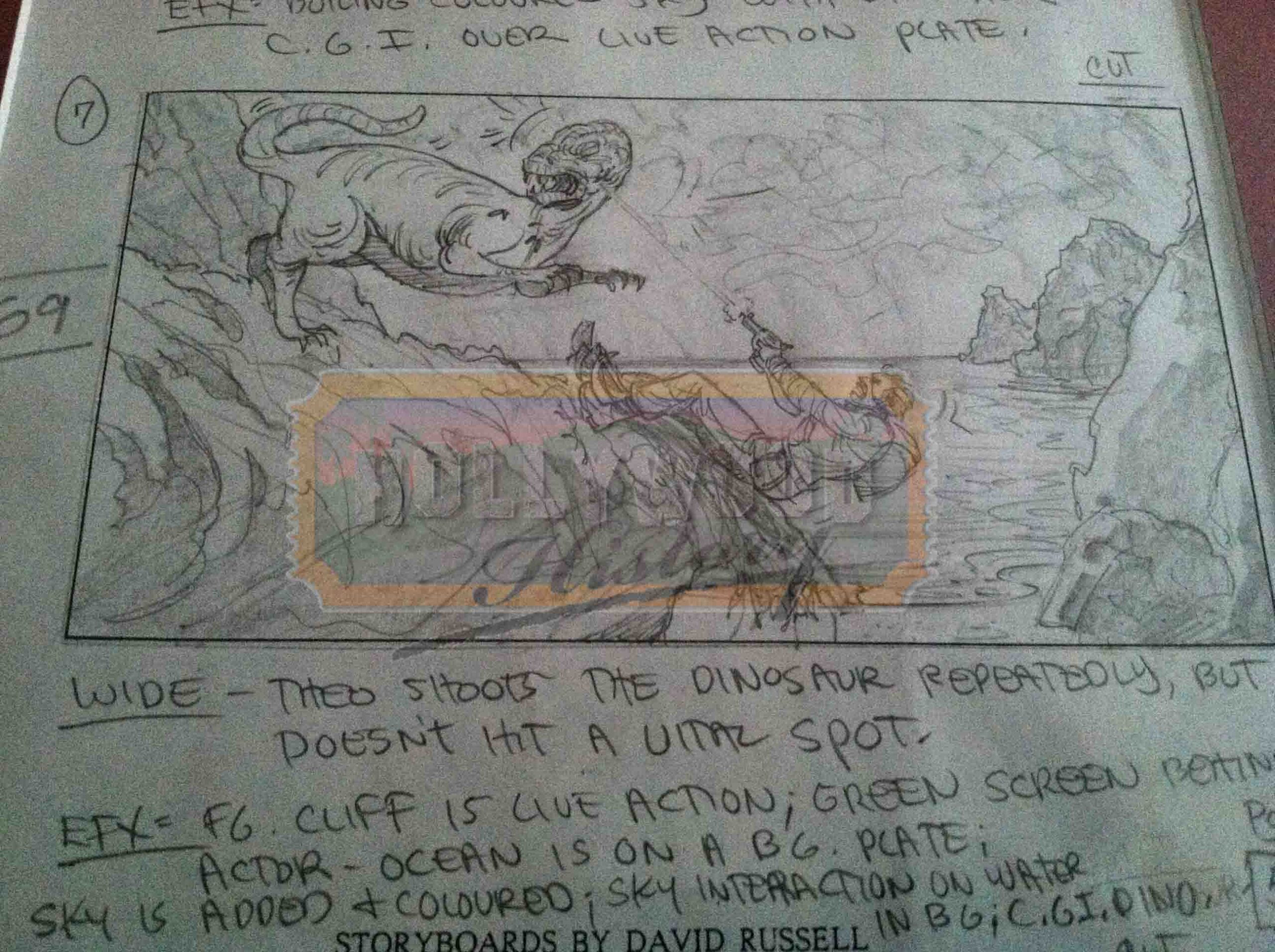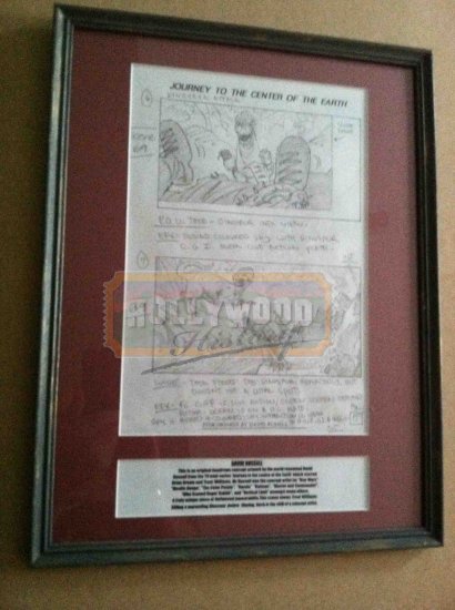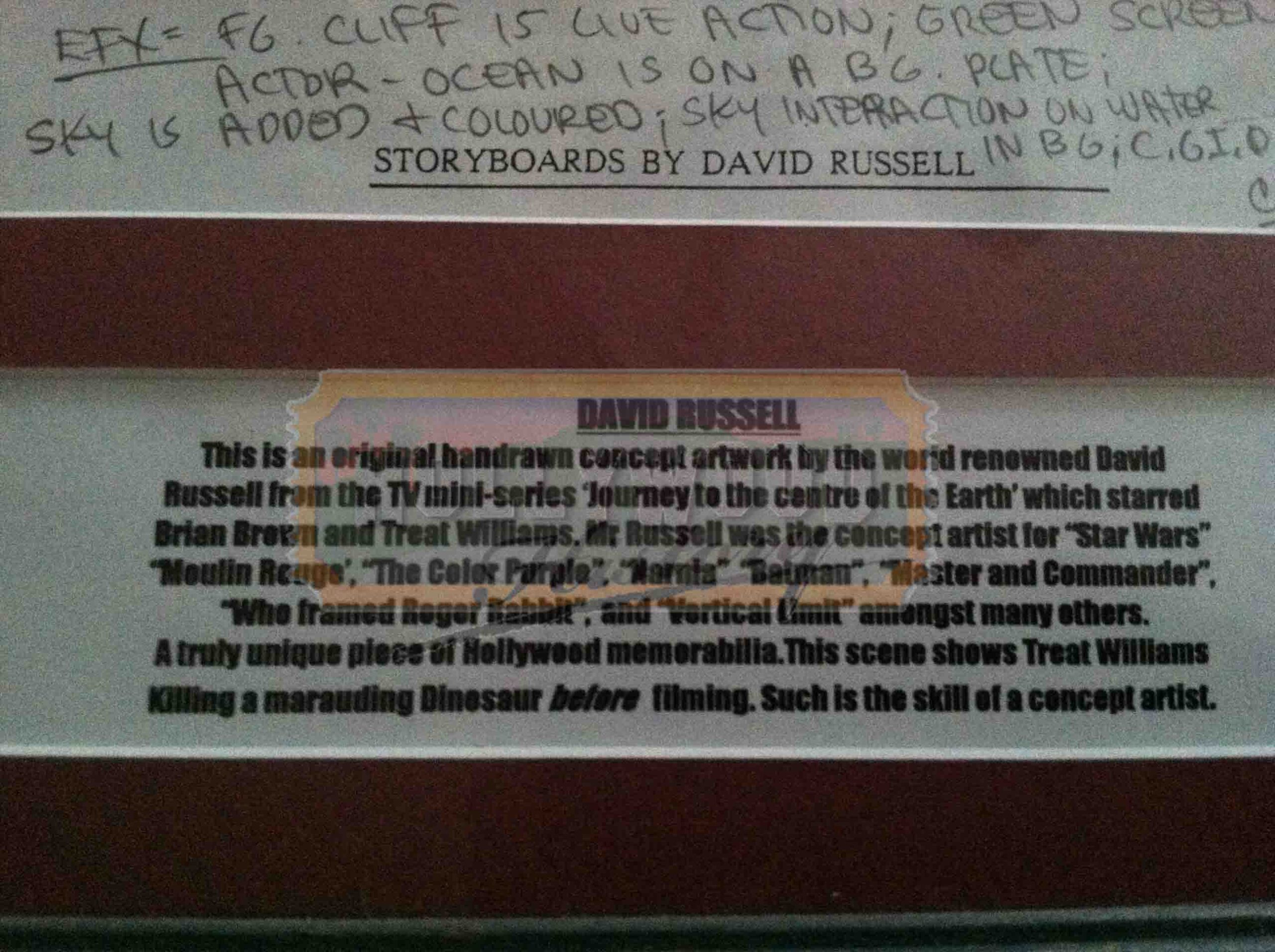 This is an original hand drawn concept art by the world renowned David Russell from the TV mini-series ‘Journey to the Center of the Earth’ which starred Brian Brown and Treat Williams. This scene shows Treat Williams killing a marauding Dinosaur before filming and a truly unique piece of Hollywood memorabilia.