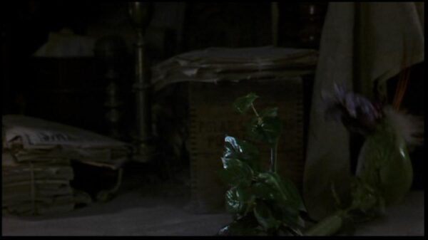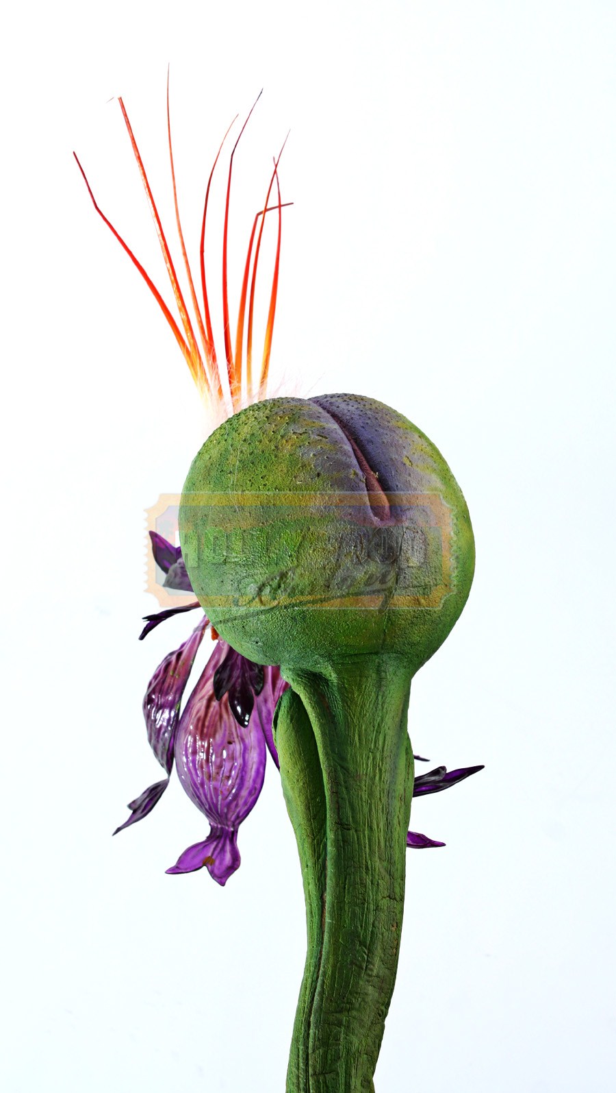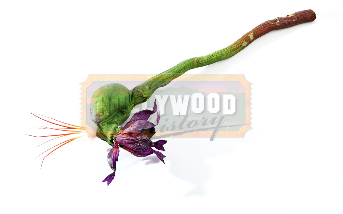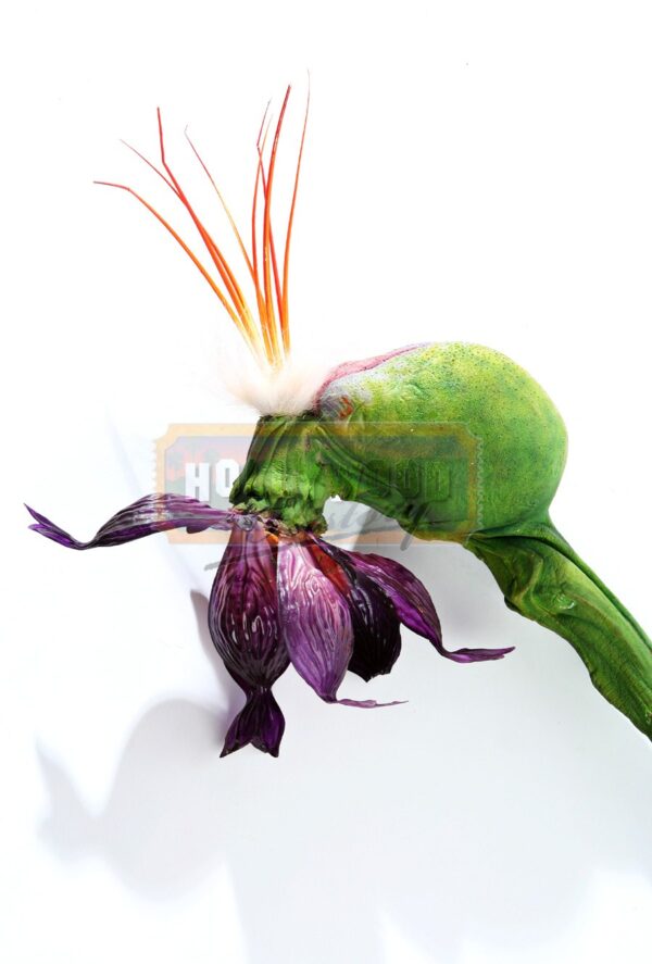 This is a flower pod from the 1995 board game adventure film Jumanji. In the film, a confection of terrors comes out of the board game Jumanji. One of those terrors is a jungle of vines and man-eating flowers. This purple flower opens and shoots a poisonous barb. This piece is made out of foam latex; it is painted green and molded to resemble a stem. The purple flower is made of plastic and there is white fur around the pod and orange, plastic pieces sticking out the back. This piece measures 34” (86cm) long and is still in very good condition. This piece will come with a signed letter of authenticity from Amalgamated Dynamics, Inc. co-founders Alec Gillis and Tom Woodruff, Jr.