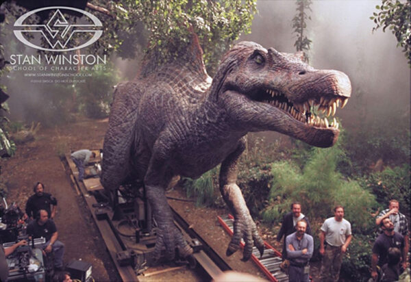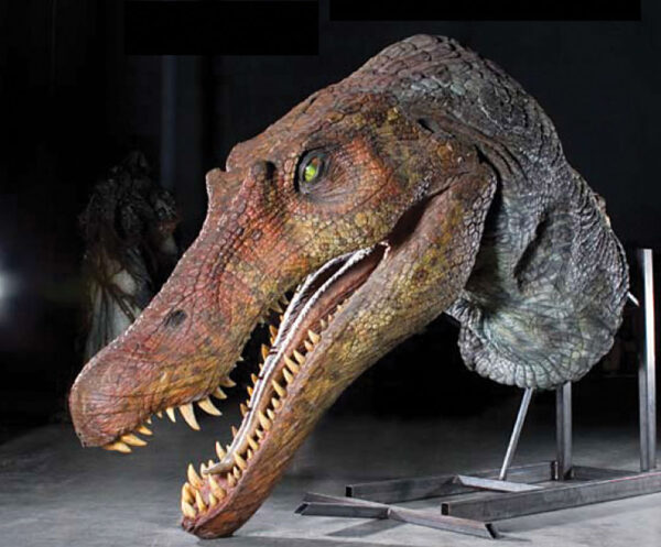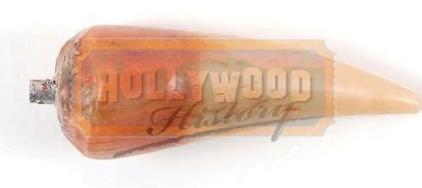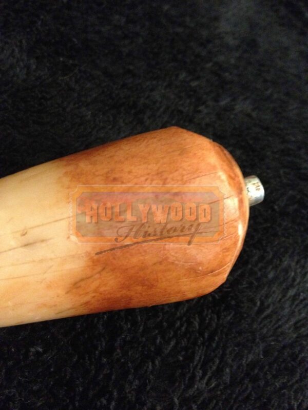 Screen-used prop Spinosaurus tooth. Wooden tooth measures 4″ long, is hand-painted brown and beige, and numbered 67 at the top, next to its screw-on attachment. Tooth was made by the renowned Stan Winston Studios and was originally obtained by a Universal Studios crew member. In fine condition.