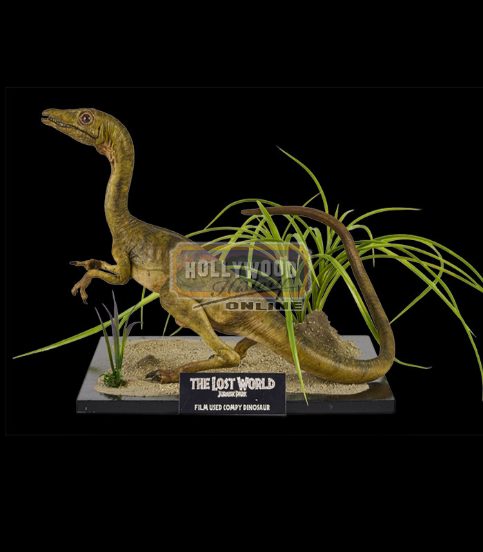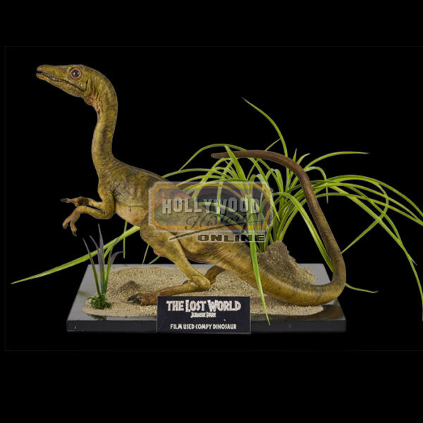 A research team is sent to the Jurassic Park Site B to study the dinosaurs there, while an InGen team approaches with another agenda. From the 1997 film The Lost World: Jurassic Park, this is a Compsognathus “Compy” puppet screen used in the film and made by Stan Winston Studios. One could look at this tiny theropod and think of it as unimportant given its size and appearance. But as one unfortunate hunter had learned the hard way; while a Compy may look harmless when alone it can be very dangerous in groups. They can be found living on the islands Nublar along with Sorna, and ranks among the smallest (and deadliest) dinosaurs in Jurassic Park. Intelligent and very active, this dinosaur nicknamed “Compy” by the Park’s workers; usually travels in packs able to chase, tire and eventually devour animals alive larger than themselves. It has been confirmed that they produce a mild venom, although it is not powerful enough to cause serious harm to an adult human. “Compys” are featured in the memorable scene in which the cruel “Stark” sadistically shocks one of these small dinosaurs only to be descended upon and ultimately devoured by a pack of the deadly creatures.