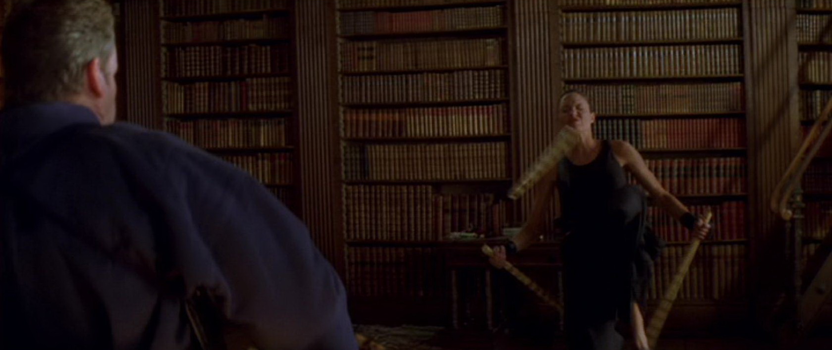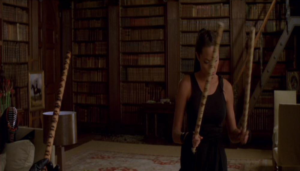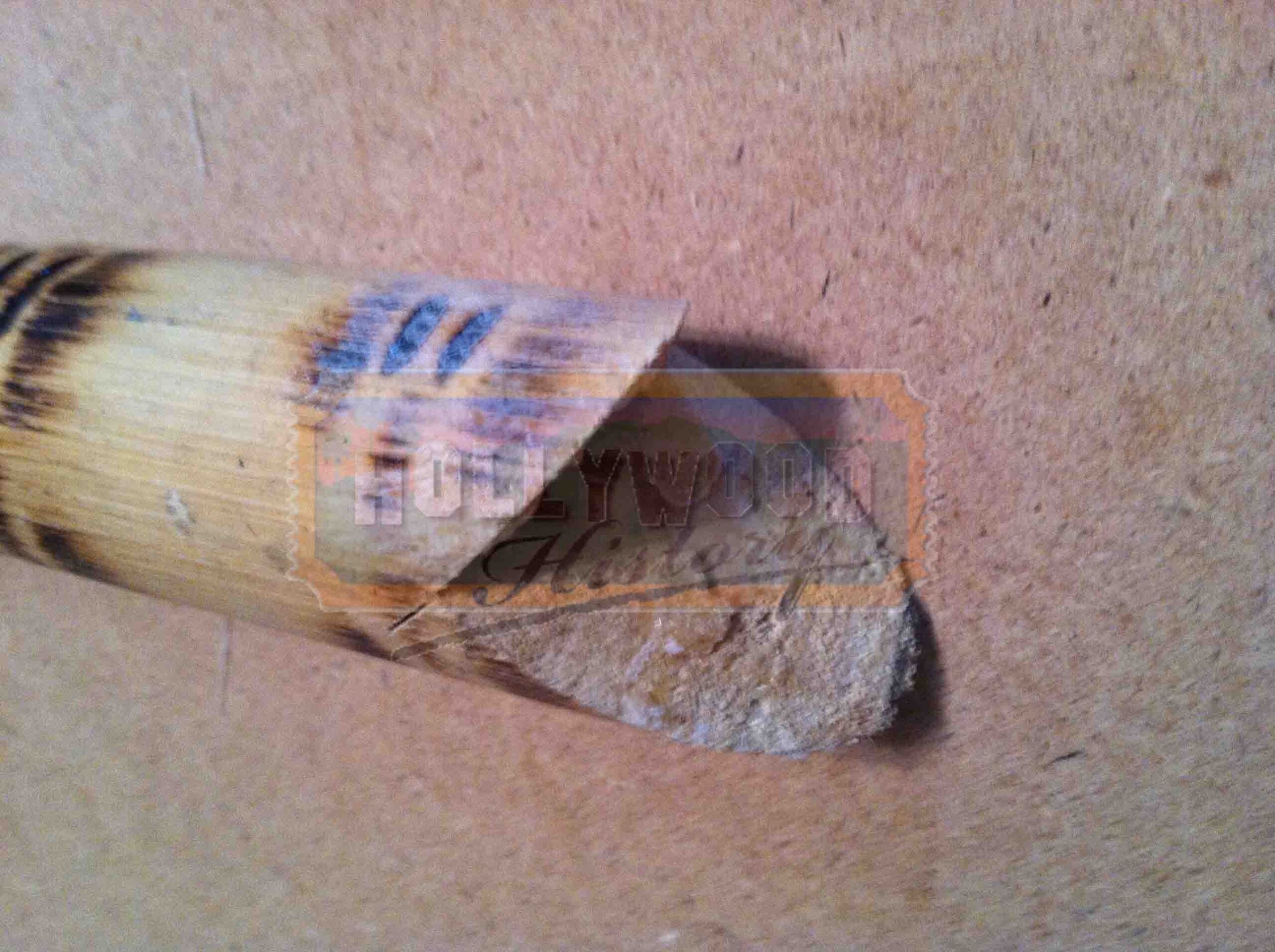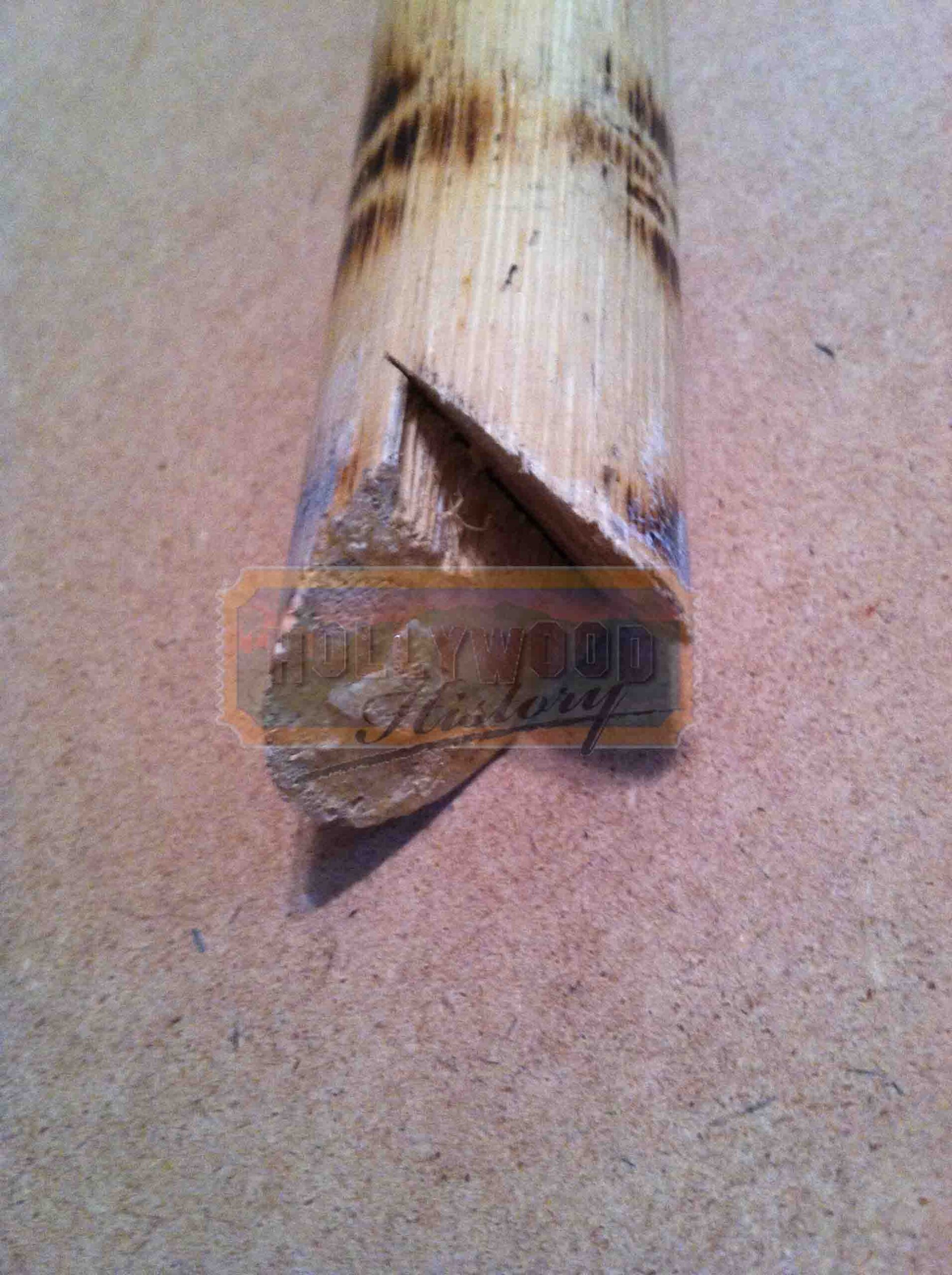Lara Croft’s (Angelina Jolie) broken wooden fighting stick used in the 2003 action sequel Tomb Raider: The Cradle of Life. This was used partway through the movie when the adventurous archaeologist (Jolie) has a workout with her affable butler Hilary (Chris Barrie). The sticks would have fit together and been glued together for the scene when she breaks the stick over her knee into three pieces. The 3cm diameter pole features a unique repeating pattern burnt on along the entire length.