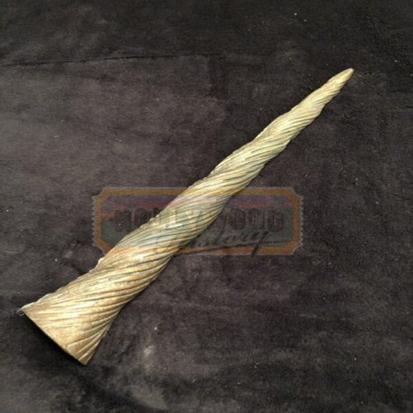 Darkness (Tim Curry) seeks to create eternal night by destroying the last of the unicorns. Jack (Tom Cruise) and his friends do everything possible to save the world and Princess Lili (Mia Sara) from the hands of Darkness. Enter a world of unicorns, magic swamps, dwarfs and rainbows. This metal Unicorn Horn has spirals running from the base to the tip of the horn. This horn was originally a gift from Nick Allder (Special Effects Supervisor) to a fellow effects artist. The Unicorn Horn is the most important prop used in the movie, features throughout the film including the slaying of Darkness.