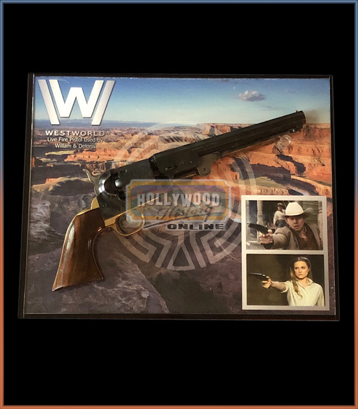 This story takes place in Westworld, a fictional, technologically advanced Wild-West-themed amusement park populated by android “hosts”. The park caters to high-paying “guests” who may indulge their wildest fantasies within the park without fear of retaliation from the hosts, who are prevented by their programming from harming humans. From the 2016 TV series Westworld, this is a live fire black powder revolver used in the series by Dolores Abernathy (Evan Rachel Wood) and William (Jimmi Simpson). Revolvers such as this one would be used when realistic gun fire was needed and the revolver is also seen closer up in the view of the camera.