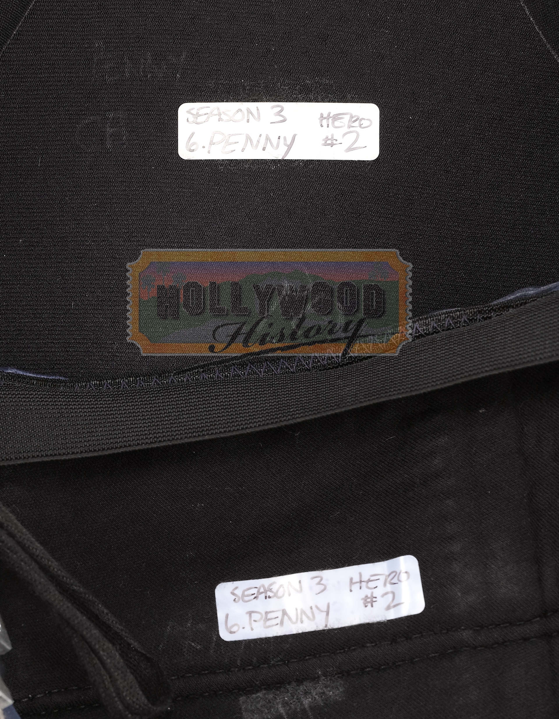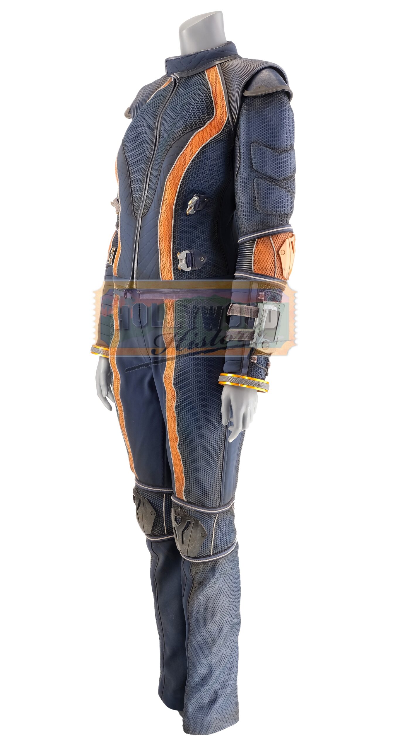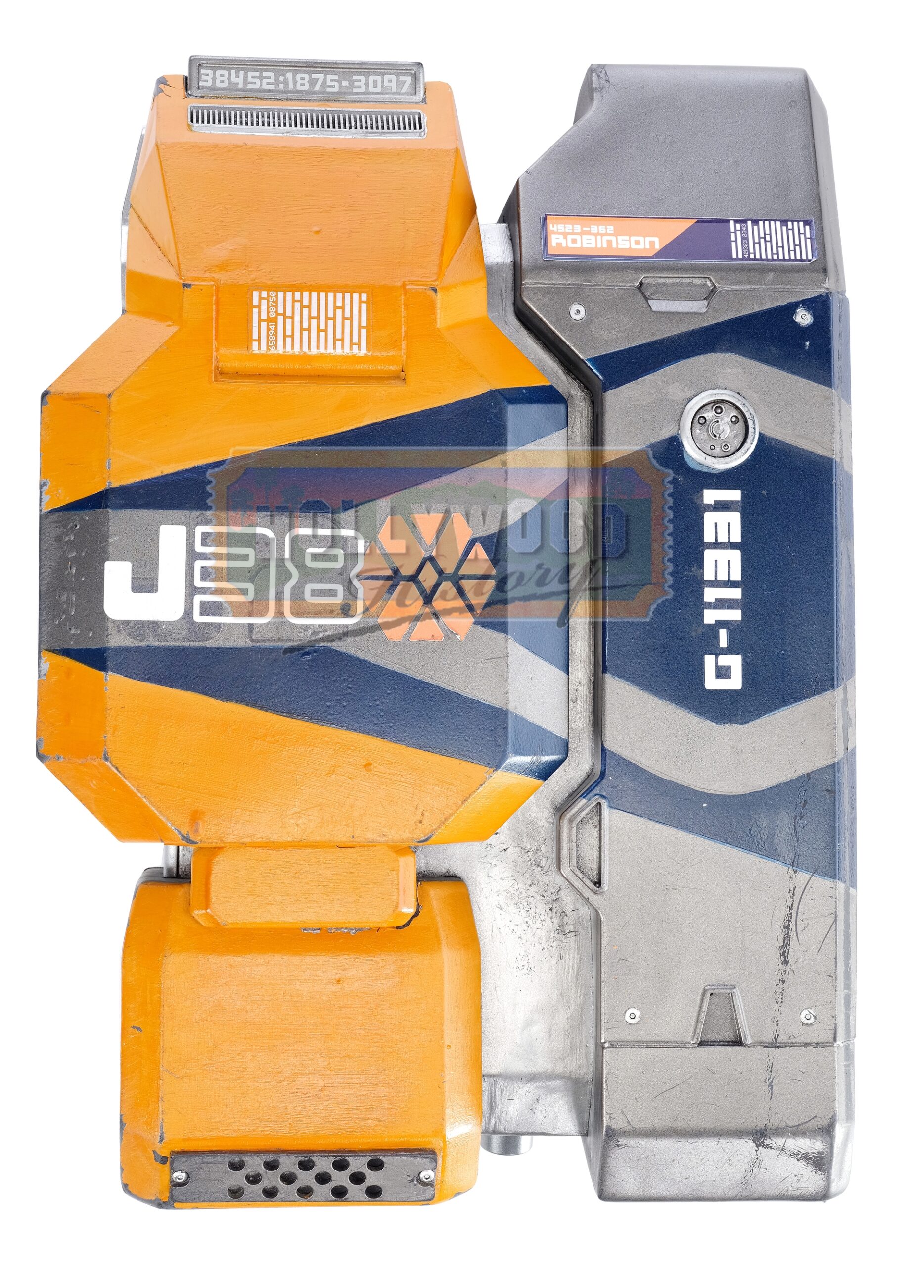 Penny Robinson’s (Mina Sundwall) spacesuit, wrist communicator and stunt backpack from Legendary Television’s sci-fi series Lost in Space. In Season 1, Penny wore her spacesuit when she escaped the Resolute. In the Season 2 episode “Shipwrecked,” Will (Maxwell Jenkins) gave the Robinsons copies of Penny’s space travel journal as Christmas gifts. This costume consists of a navy blue lycra and nylon blend jacket marked “Penny 2 Hero Season 3”, matching trousers, a grey plastic wrist communicator, a hand-painted grey and orange foam backpack labelled “Robinson”.