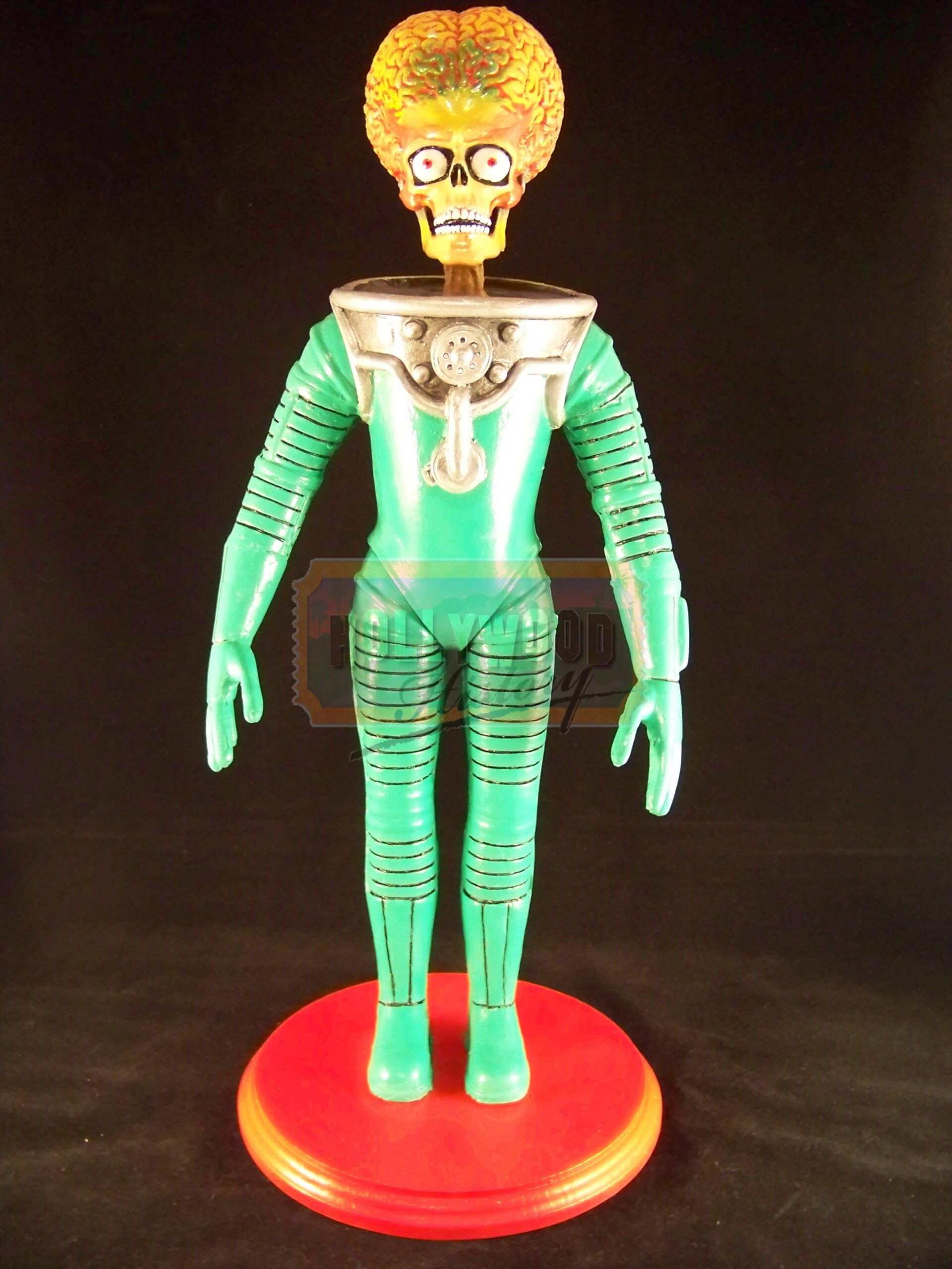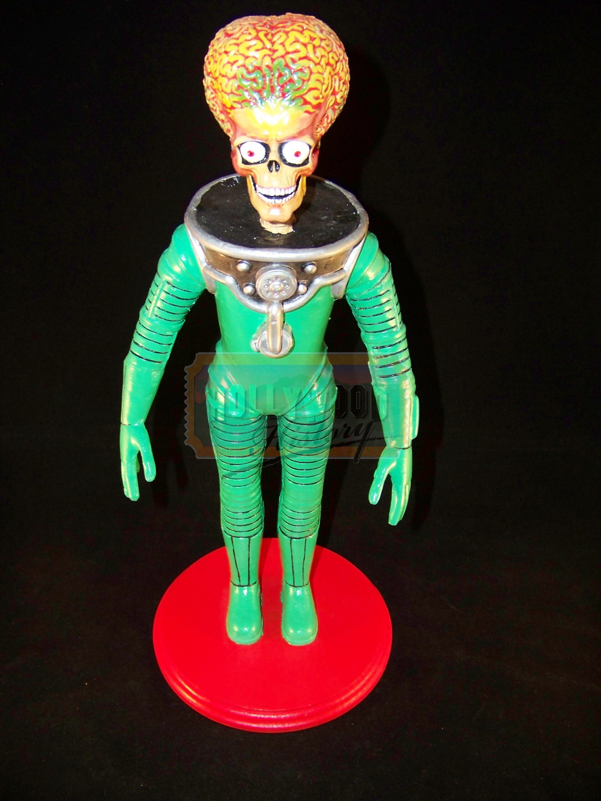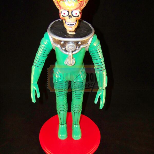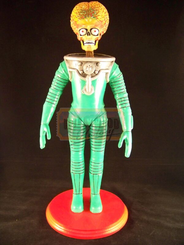 Mars Attacks! is a 1996 comic science fiction film directed by Tim Burton and based on the cult trading card series of the same name. For production,the filmmakers hired Industrial Light & Magic to create the Martians using computer animation after their previous plan to use stop motion fell through because of budget limitations. This is a production used Martian Maquette. Maquette’s such as this one was used for CGI reference in designing the look of the Martian’s. This Maquette is approx. 16″ tall, made of resin with a wooden base. Being the film’s Martian’s were provided via CGI this is key piece from production used in making the film.