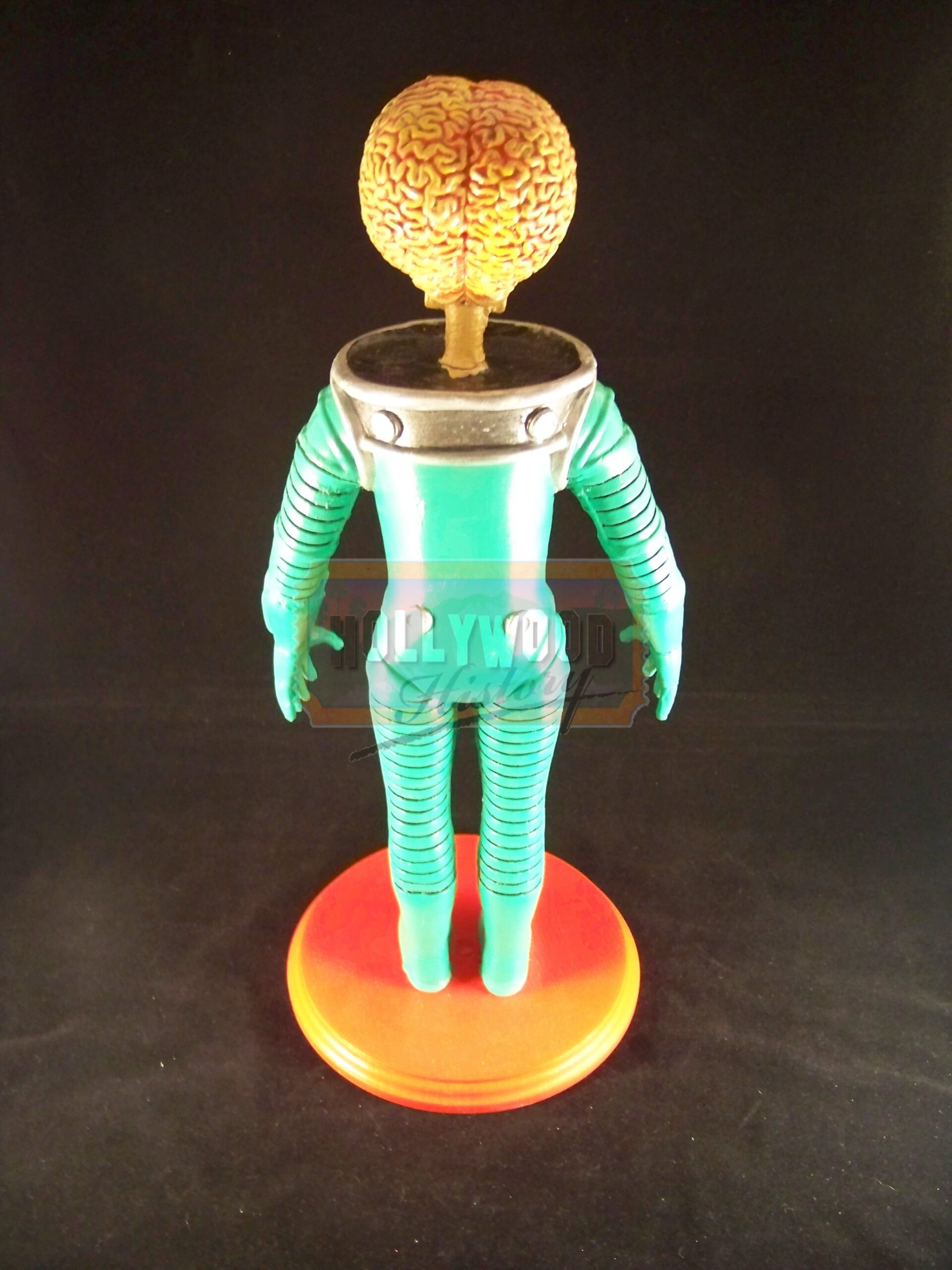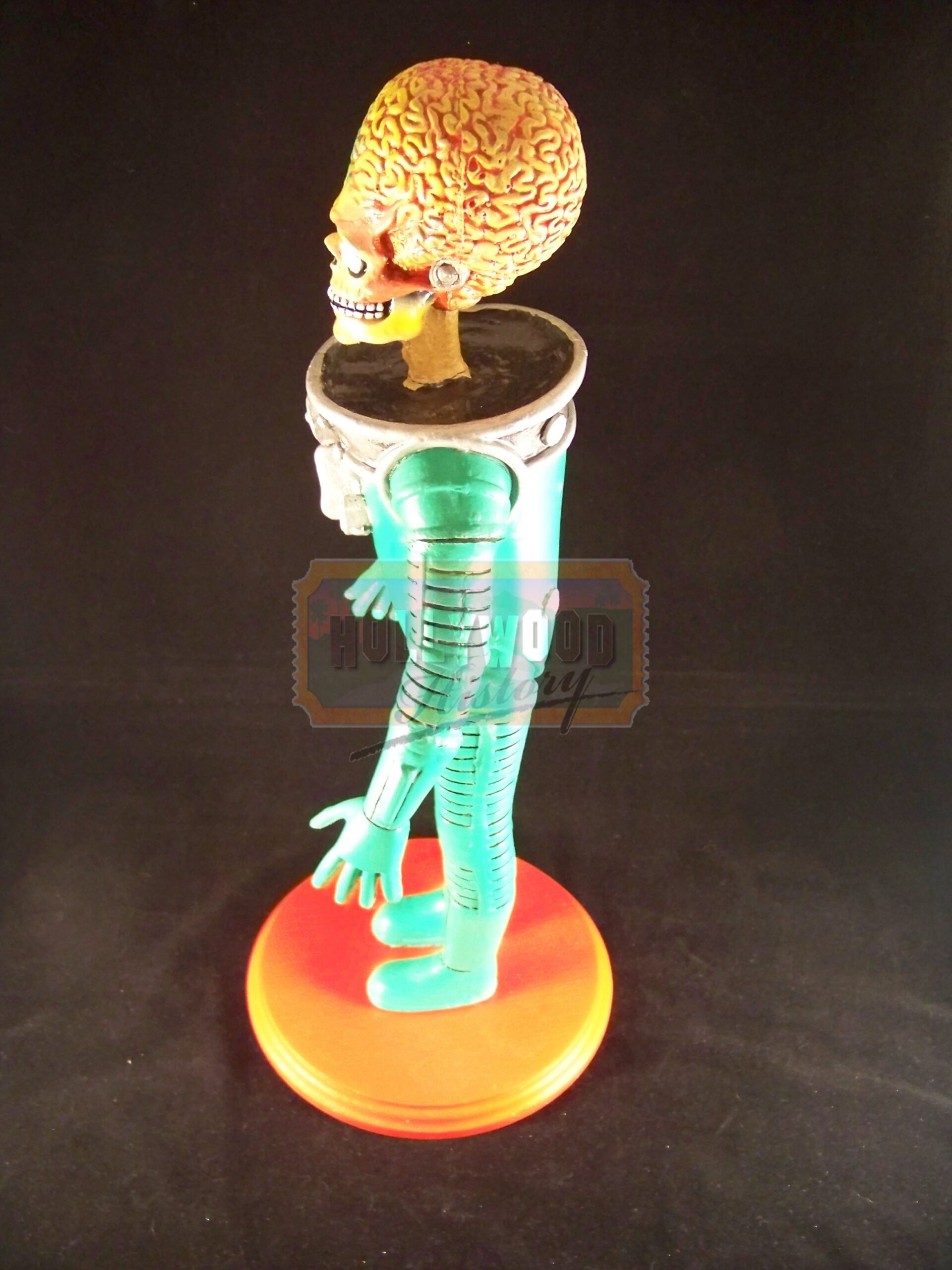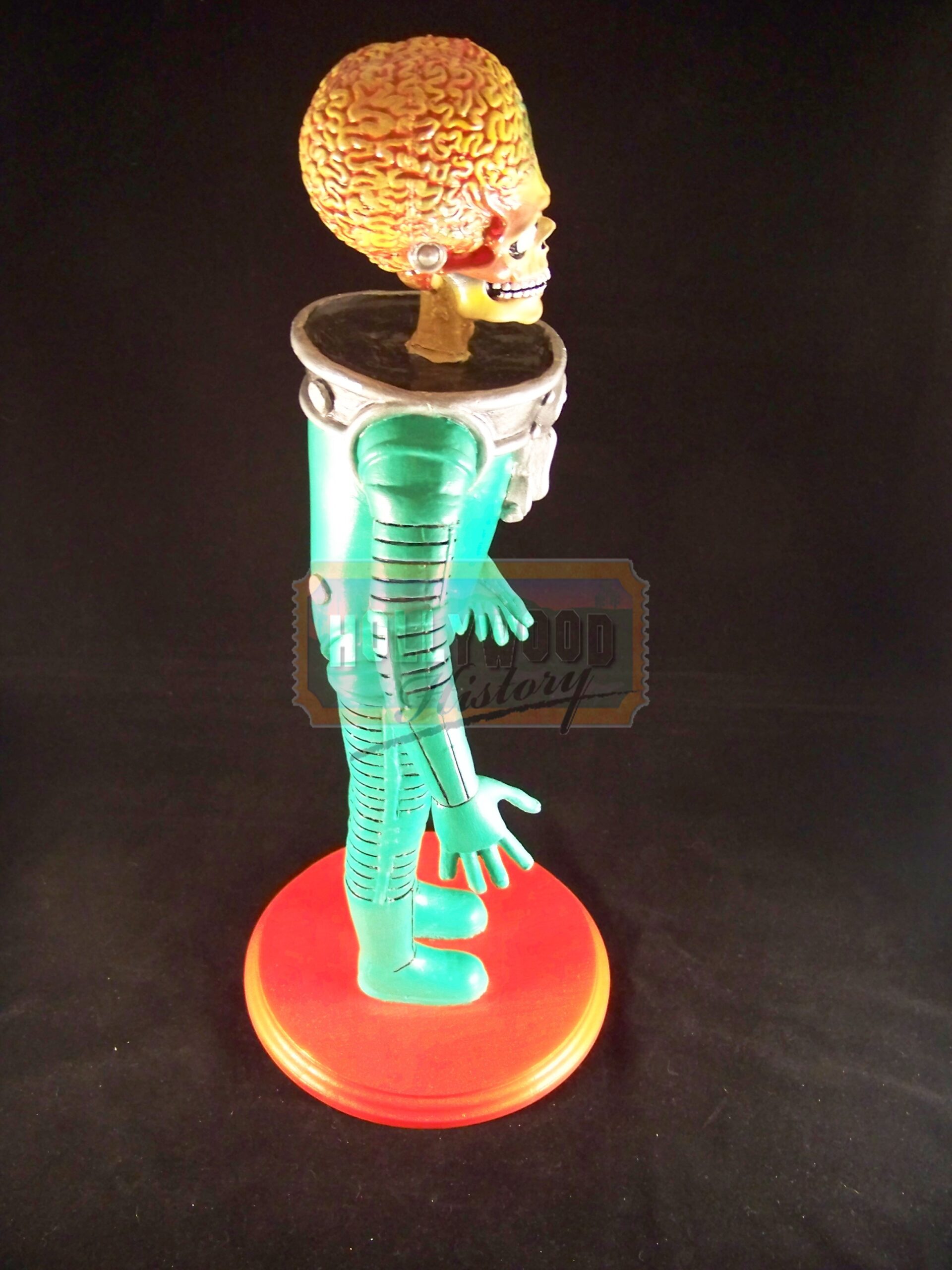 Mars Attacks! is a 1996 comic science fiction film directed by Tim Burton and based on the cult trading card series of the same name. For production,the filmmakers hired Industrial Light & Magic to create the Martians using computer animation after their previous plan to use stop motion fell through because of budget limitations. This is a production used Martian Maquette. Maquette’s such as this one was used for CGI reference in designing the look of the Martian’s. This Maquette is approx. 16″ tall, made of resin with a wooden base. Being the film’s Martian’s were provided via CGI this is key piece from production used in making the film.