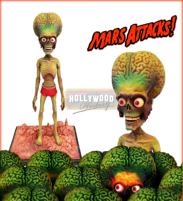 This is an original “Martian” stop-motion animation puppet from the 1996 Tim Burton film, Mars Attacks! This film was originally planned as a stop motion homage to the old Ray Harryhausen films; however they ultimately decided upon computer-generated animation and based their animation upon these stop-motion puppets. The puppets were then used to scan in assisting with the computer generated animation featured in the live action film. The puppet stands approx. 14″ tall and is built of a steel and aluminum armature, and was obtained directly from Warner Bros Archive.