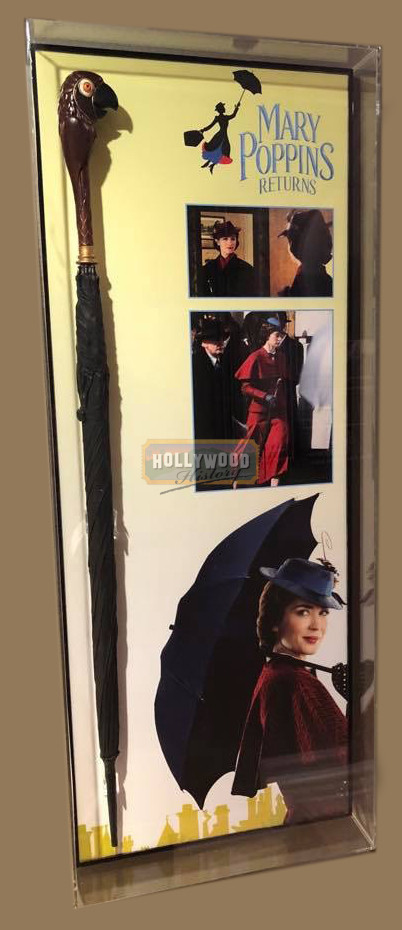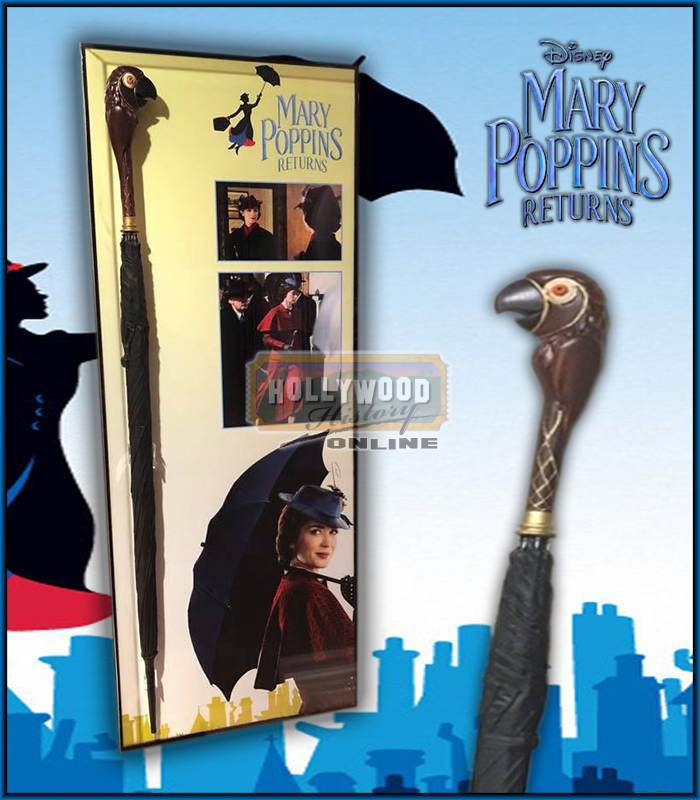In Depression-era London, a now-grown Jane and Michael Banks, along with Michael’s three children, are visited by the enigmatic Mary Poppins following a personal loss. Through her unique magical skills, and with the aid of her friend Jack, she helps the family rediscover the joy and wonder missing in their lives. From the sequel to the film Mary Poppins and set 25 years after the original 1964 film this is Mary Poppins’ (Emily Blunt) stunt umbrella from the 2018 Disney film, Mary Poppins Returns. This umbrella can be seen in pictures from the film set and made of a light weight material to assist in it being easy to carry and to not injure the actress depending on the scene while also being used to not damage the hero umbrella.