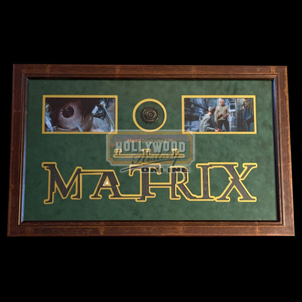 This is a screen used headjack worn by various main cast members from the 1999 film, The Matrix. The data port allows humans to interface with the Matrix and other simulated realities. These were applied and then carefully removed after filming and stored by the make-up effects crew to be reused daily. Already displayed in a frame, the center in the “A” has come apart from the mat but could easily be repaired.