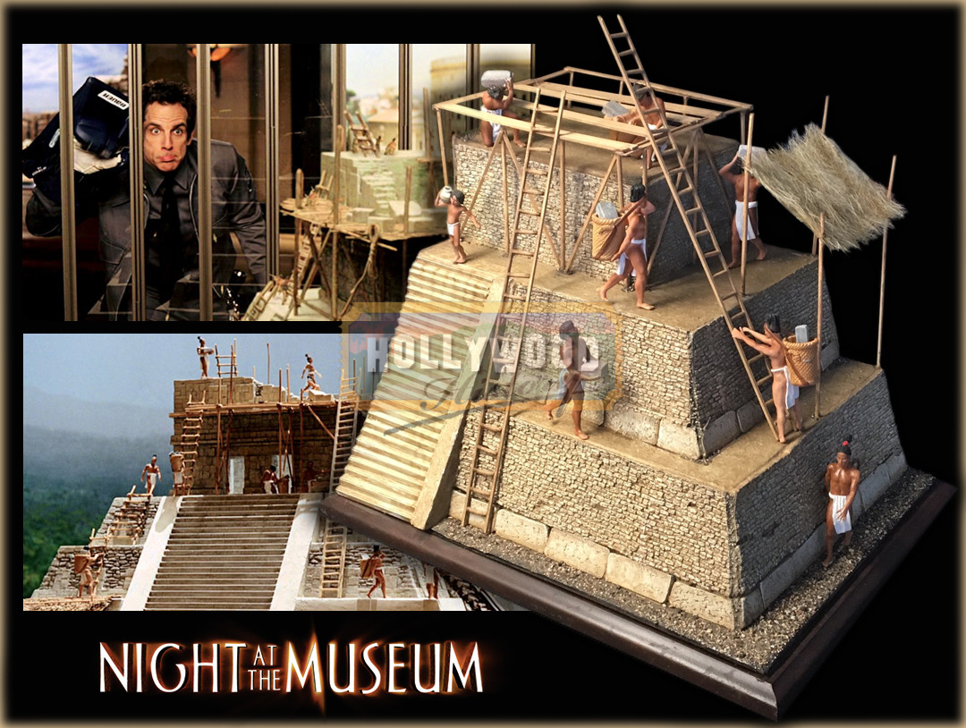 A newly recruited night security guard at the Museum of Natural History discovers that an ancient curse causes the animals and exhibits on display to come to life and wreak havoc. From the 2006 film Night at the Museum, these figures were used in “The Hall of Miniatures” exhibit in the Museum’s Mayan diorama display. As the inhabitants of the diorama, the miniature people magically come to life at night and can be seen in the foreground. The Mayans can been seen multiple times including when Jedediah the miniature cowboy and his men capture Larry (Ben Stiller) after he is hit by miniature darts fired by the miniature figurines from the Mayan diorama. The beautifully detailed and hand painted figures are constructed of a resin type material with a protruding pin to the base for ease of secure placement on set while the temple style display was made to give the feeling of the diorama seen on screen.