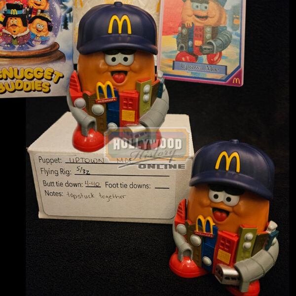 On December 11 2023, McDonald’s gave their fans around the world a fresh take on a classic unboxing experience with a favorite McDonald’s meal and reimagined McNugget Buddies.  This is the puppet of Uptown Moe used in the McDonald’s Commercial and for the campaign’s promotional photography. The backside of the puppet contains area for rigging to be attached to the puppet with one being filled located behind the hat. The puppet comes with it’s original production box identifying the version of puppet, along with the actual toy version of Uptown Moe found inside a Kerwin Frost Box.