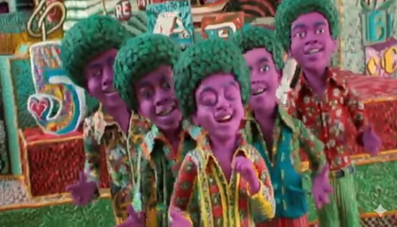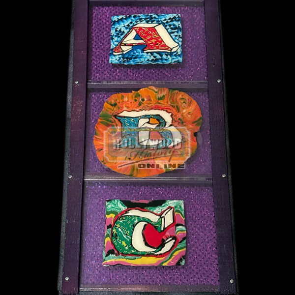 Moonwalker is a 1988 musical film starring Michael Jackson and rather than featuring one continuous narrative, the film expresses the influence of fandom and innocence through a collection of short films about Jackson. These are clay Strata-cut slices used during animation in Segment 2: “Retrospective” when the Jackson 5 sing the song “ABC”. The Strata-cut slices have been mounted inside a frame to protect the clay pieces along with the back of the display being signed by creator/animator: David Daniels.