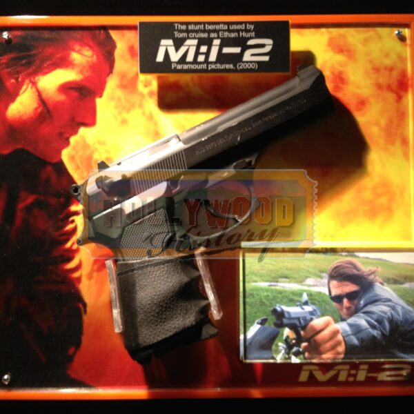 This romantic action-thriller plunges Impossible Missions Force agent Ethan Hunt (Tom Cruise) into an international crisis of terrifying magnitude. With computer genius Luther Stickell (Ving Rhames) at his side and a beautiful thief (Thandie Newton) on his mind, Hunt races across Australia and Spain to stop a former IMF agent from unleashing a genetically engineered biological weapon called “Chimera” on the world. This stunt beretta was used by Ethan Hunt (Tom Cruise) during scenes in the film when the hero handgun would be too dangerous or was not needed and has ever detail to the hero beretta. The serial number can even be spotted on the barrel to make this prop appear real on screen. This item comes with a custom wall mount display and custom plaque.